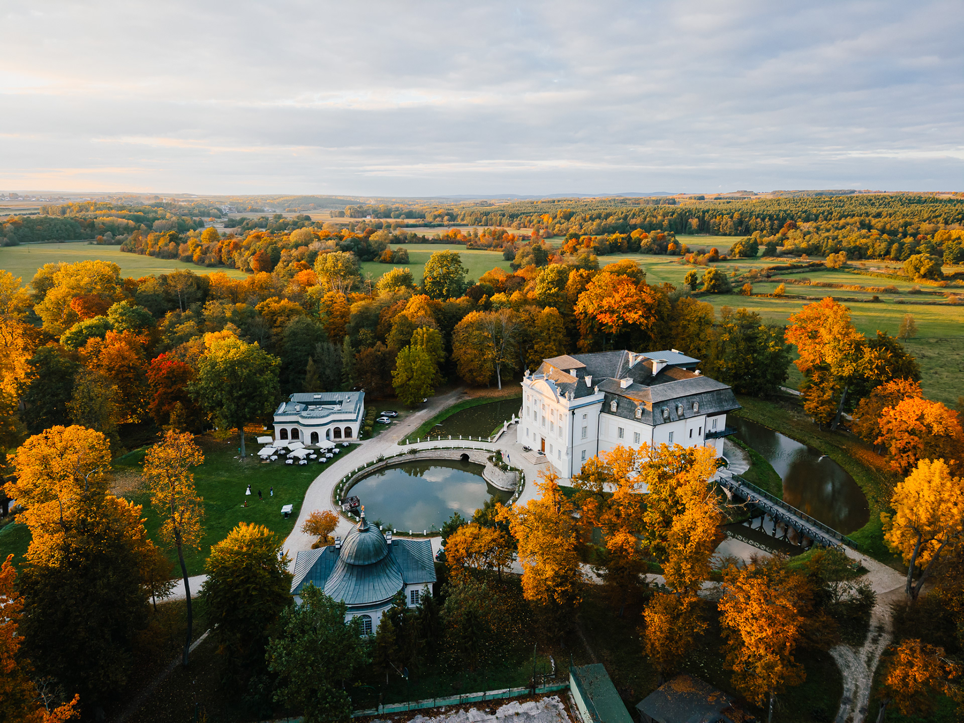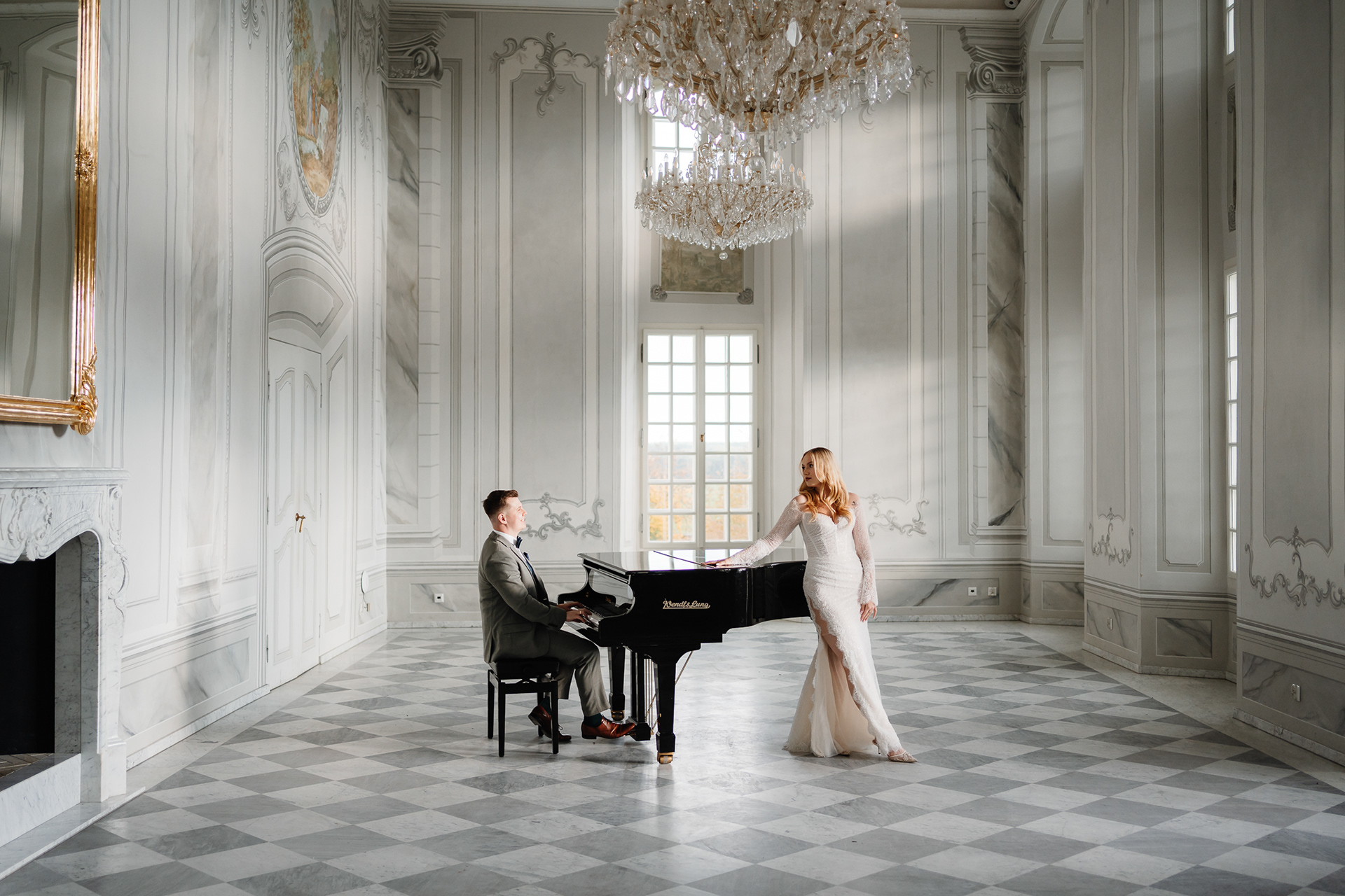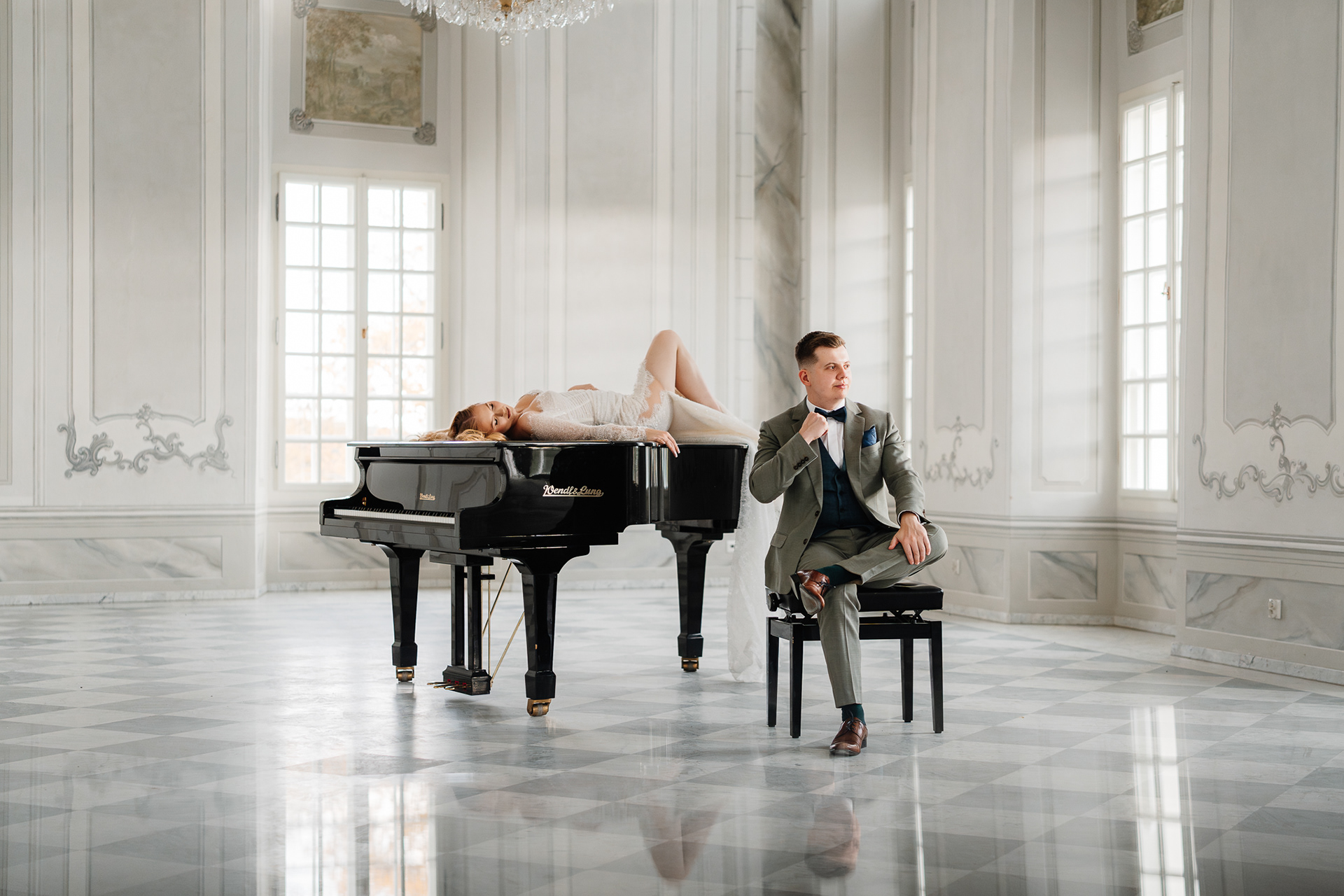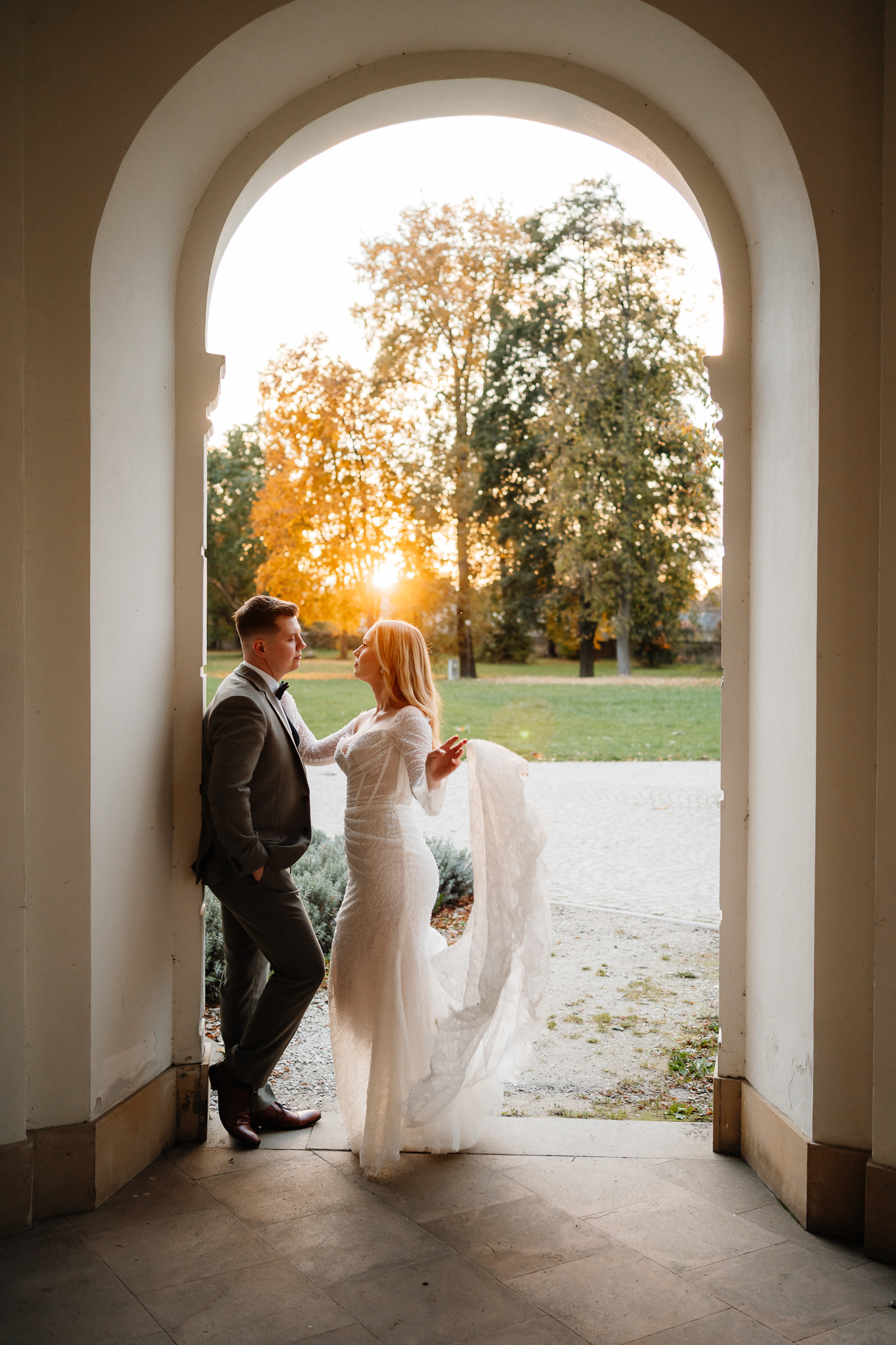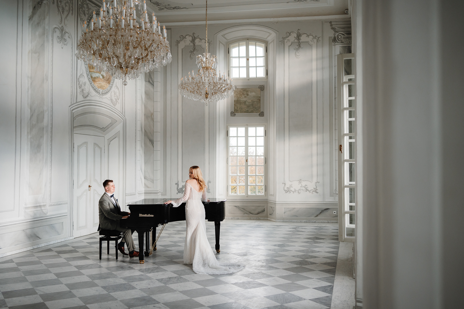 Wyjątkowa sala balowa z fortepianem, eleganckie wnętrza i magiczne światło jesiennego zachodu słońca stworzyły idealną scenerię do niepowtarzalnych zdjęć ślubnych.