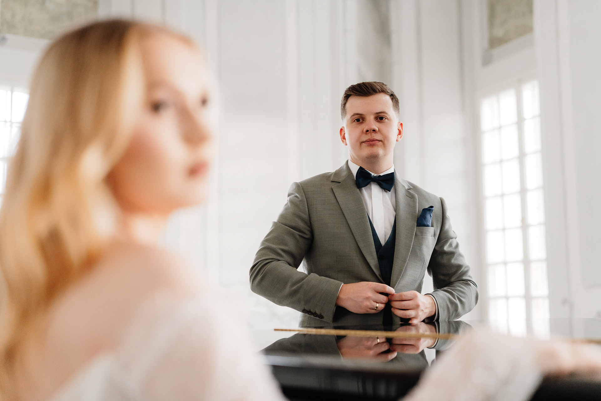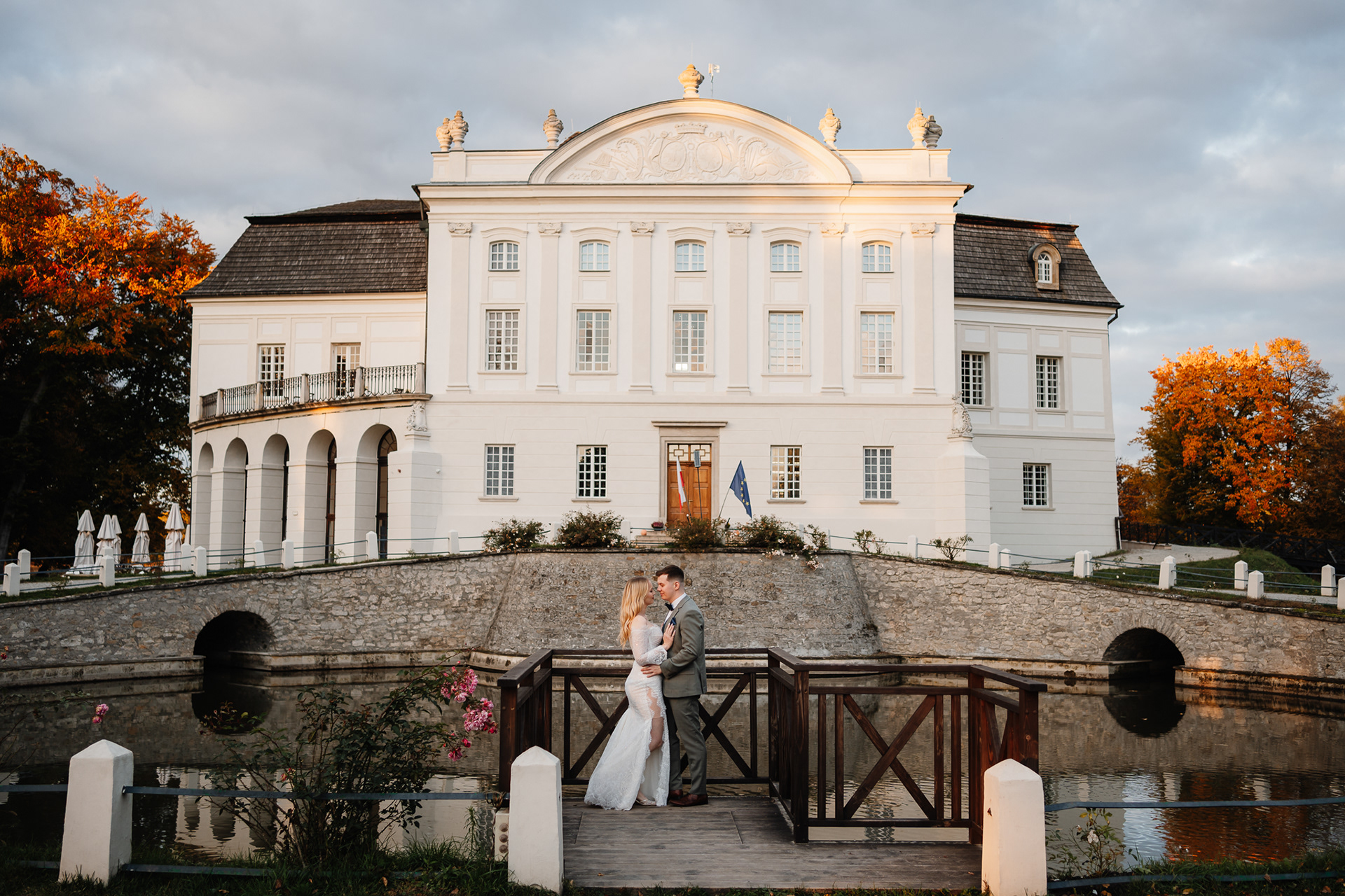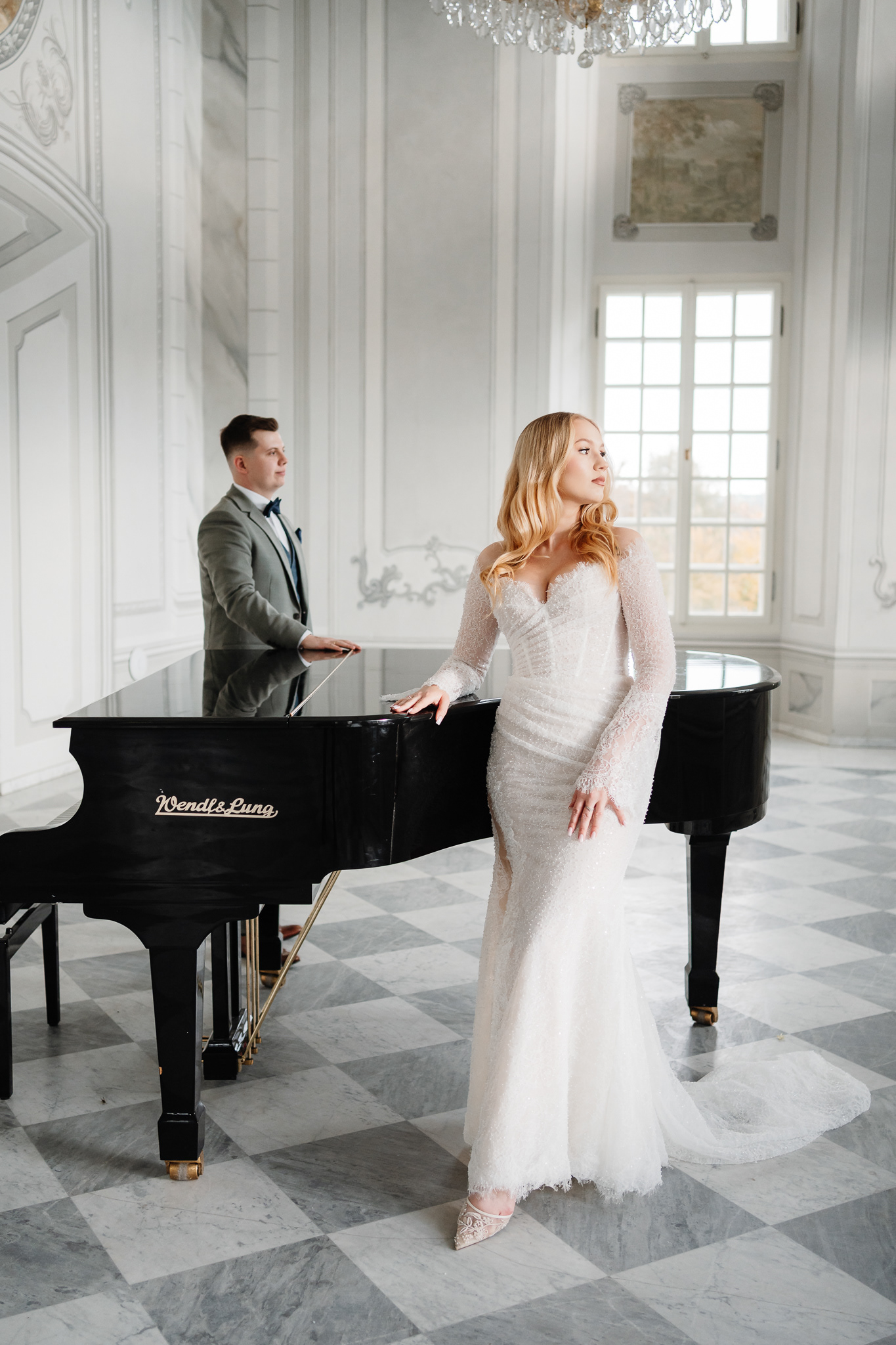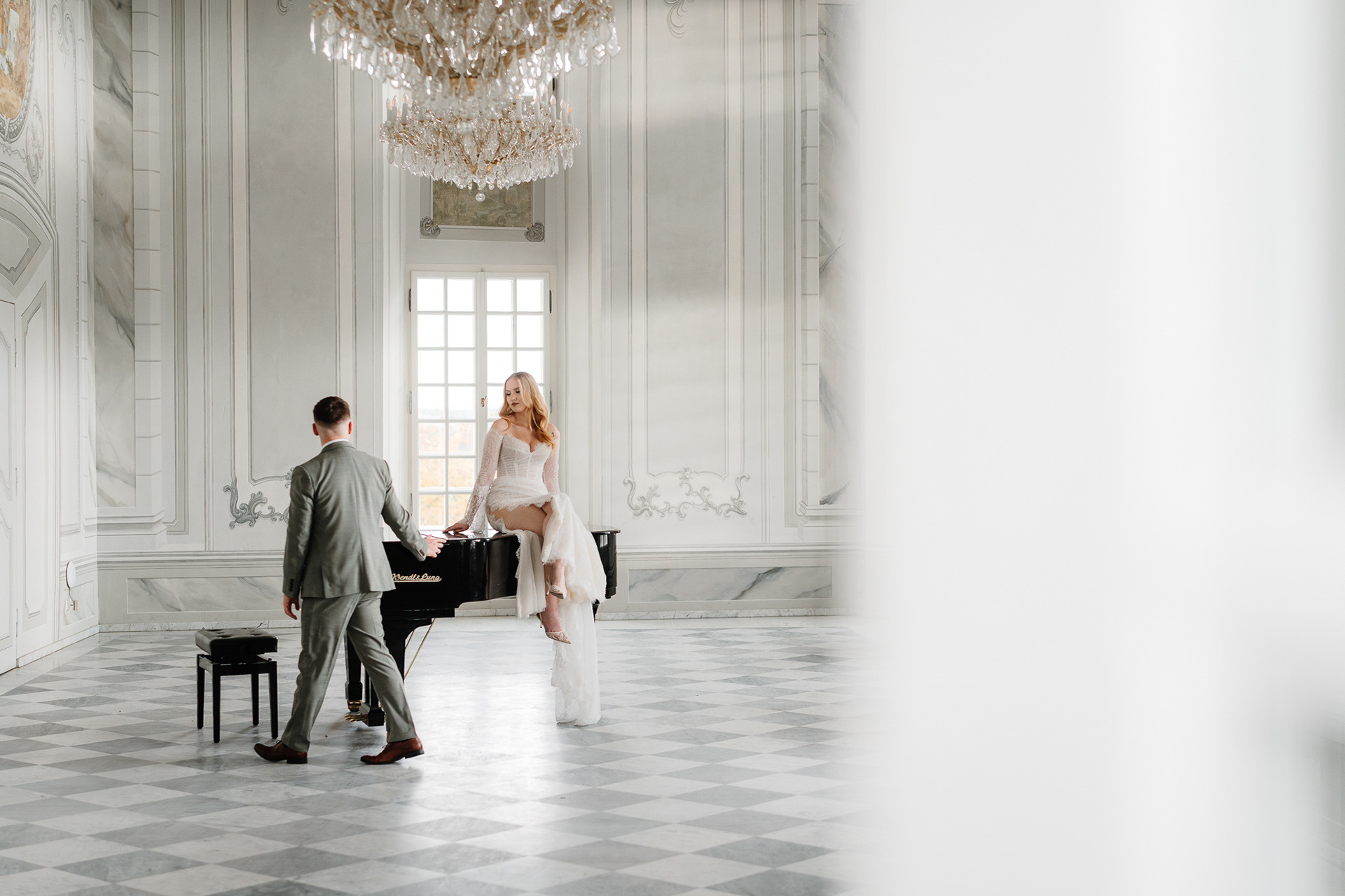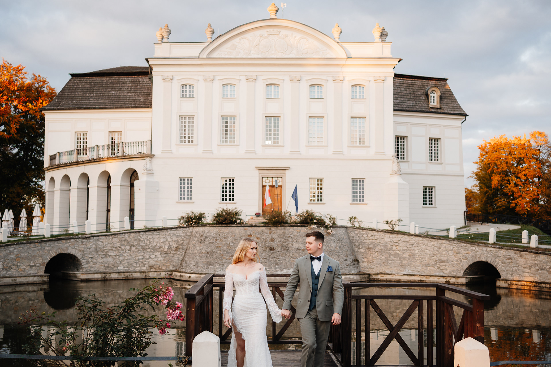 Wyjątkowa sala balowa z fortepianem, eleganckie wnętrza i magiczne światło jesiennego zachodu słońca stworzyły idealną scenerię do niepowtarzalnych zdjęć ślubnych.