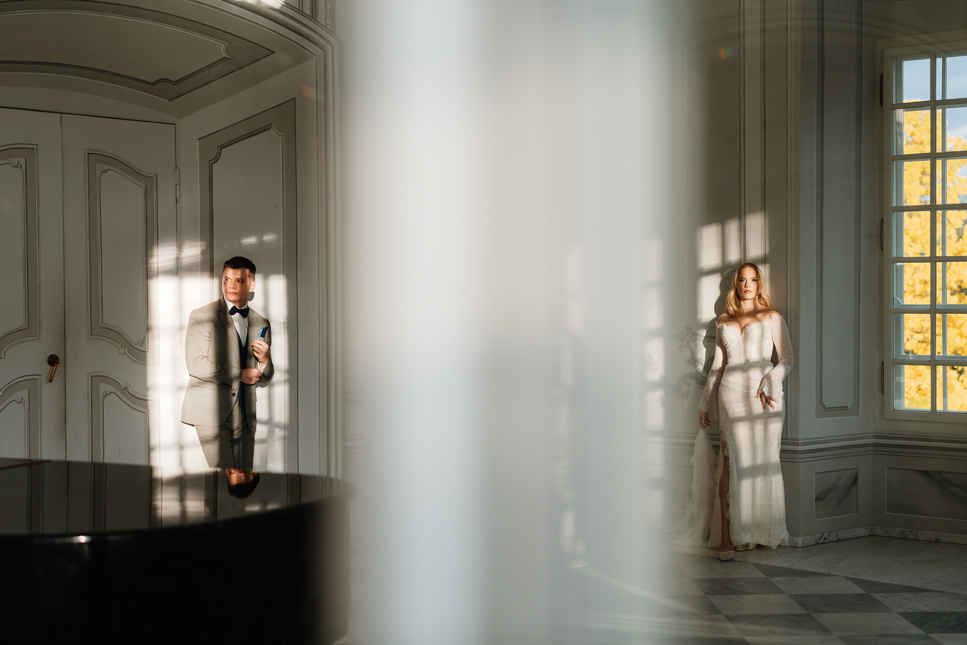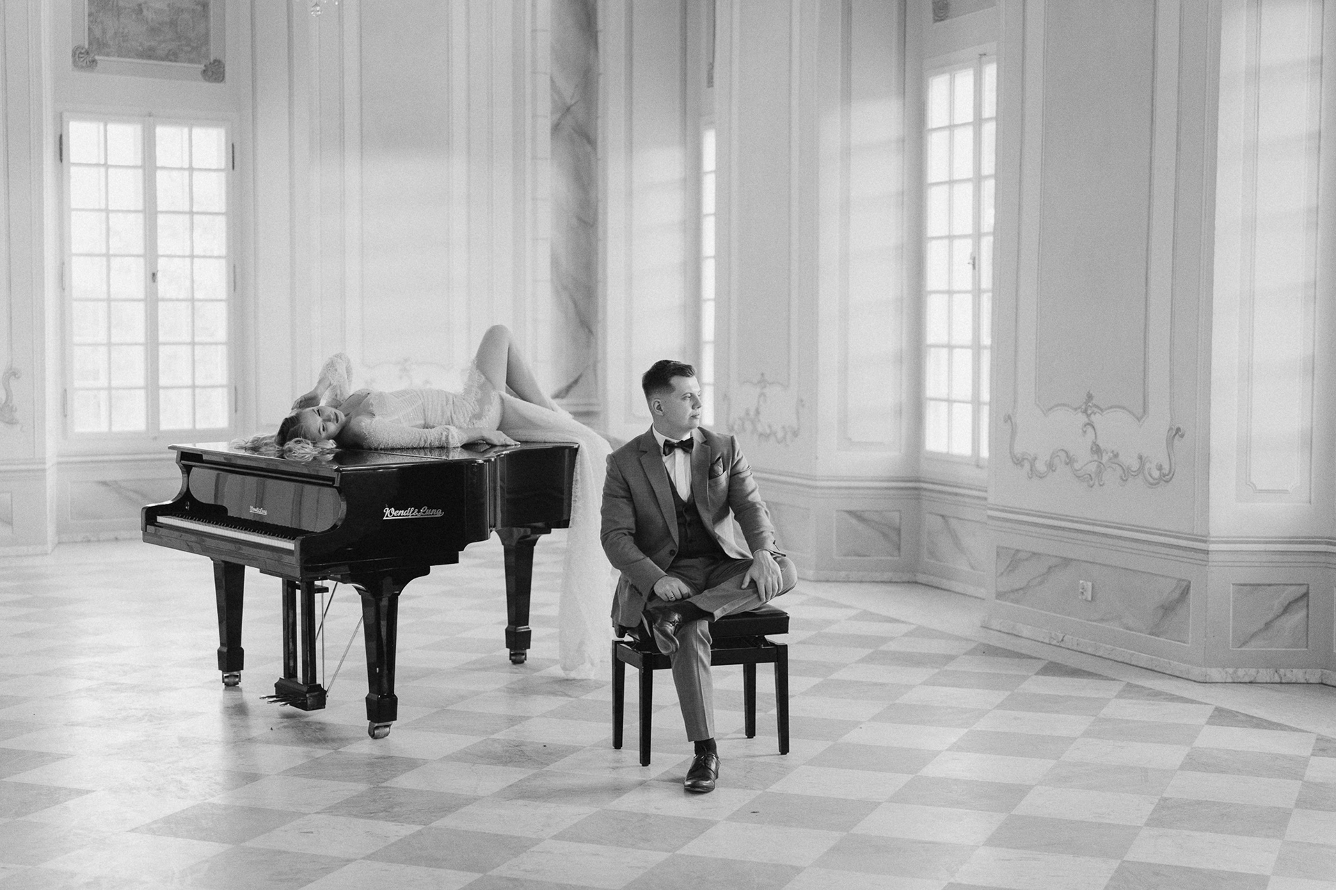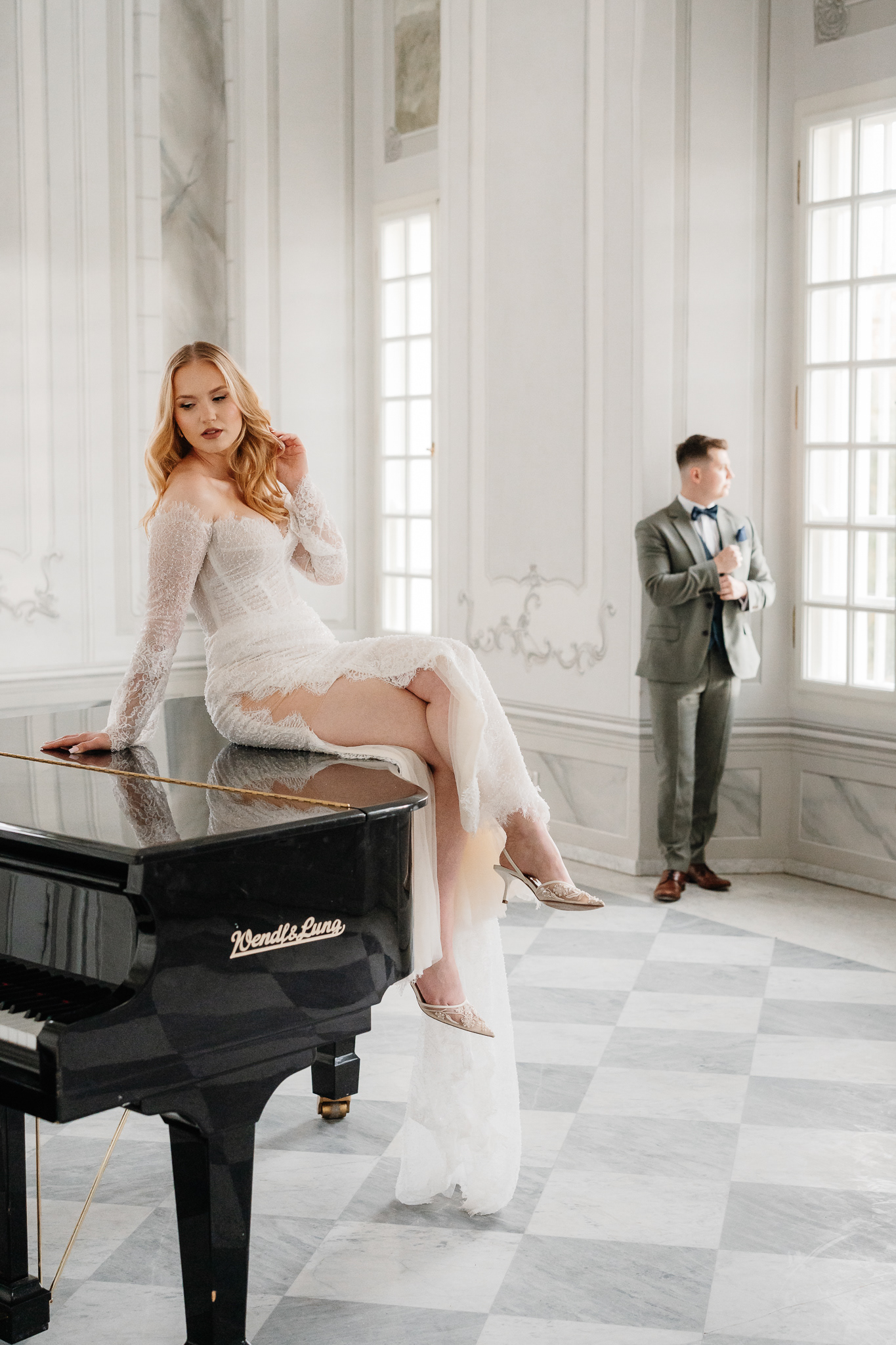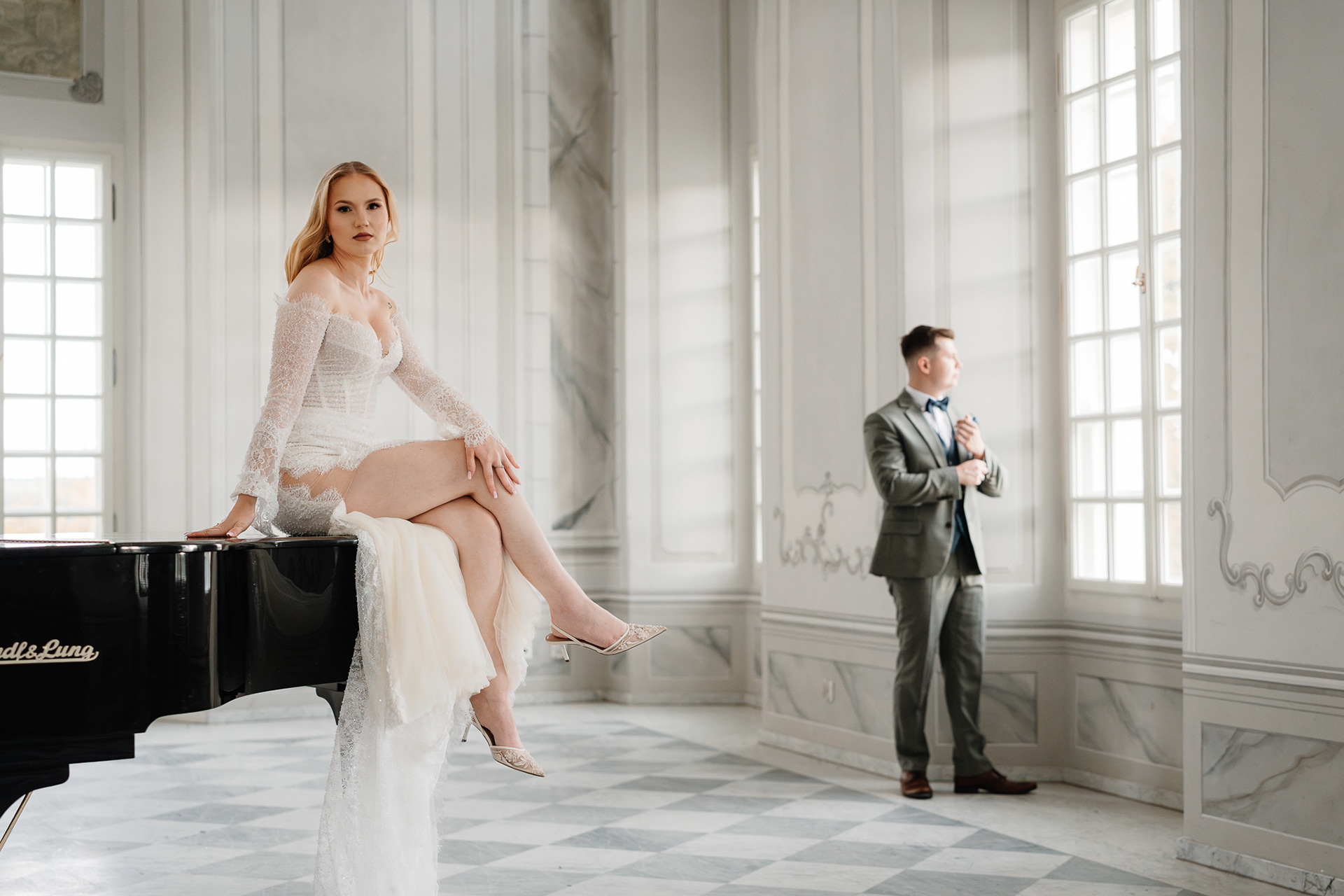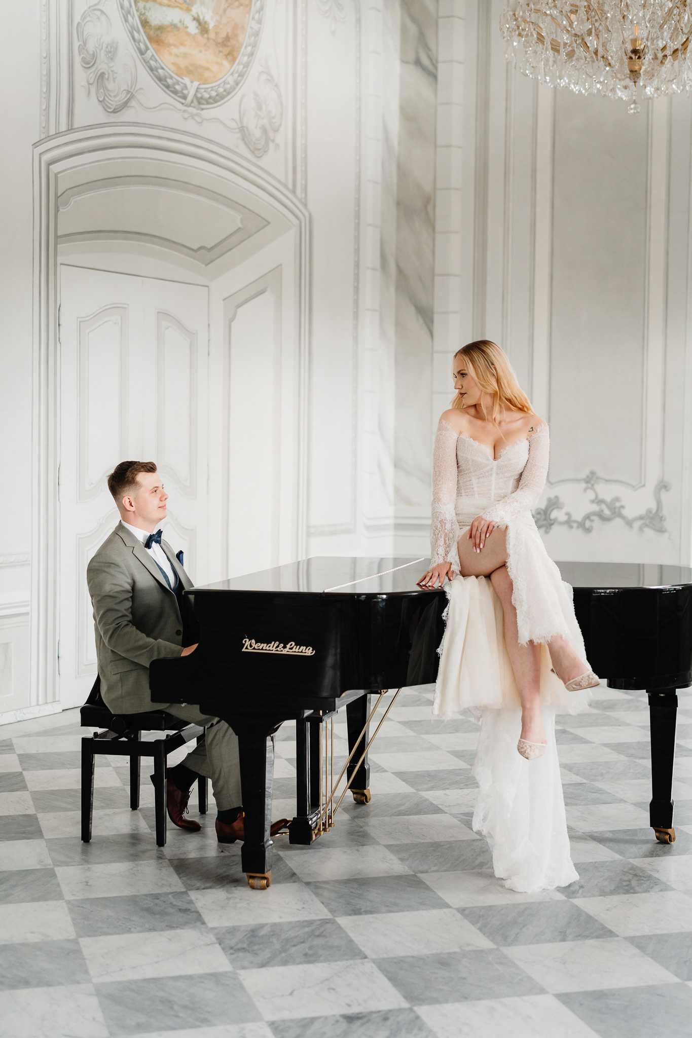 Wyjątkowa sala balowa z fortepianem, eleganckie wnętrza i magiczne światło jesiennego zachodu słońca stworzyły idealną scenerię do niepowtarzalnych zdjęć ślubnych.