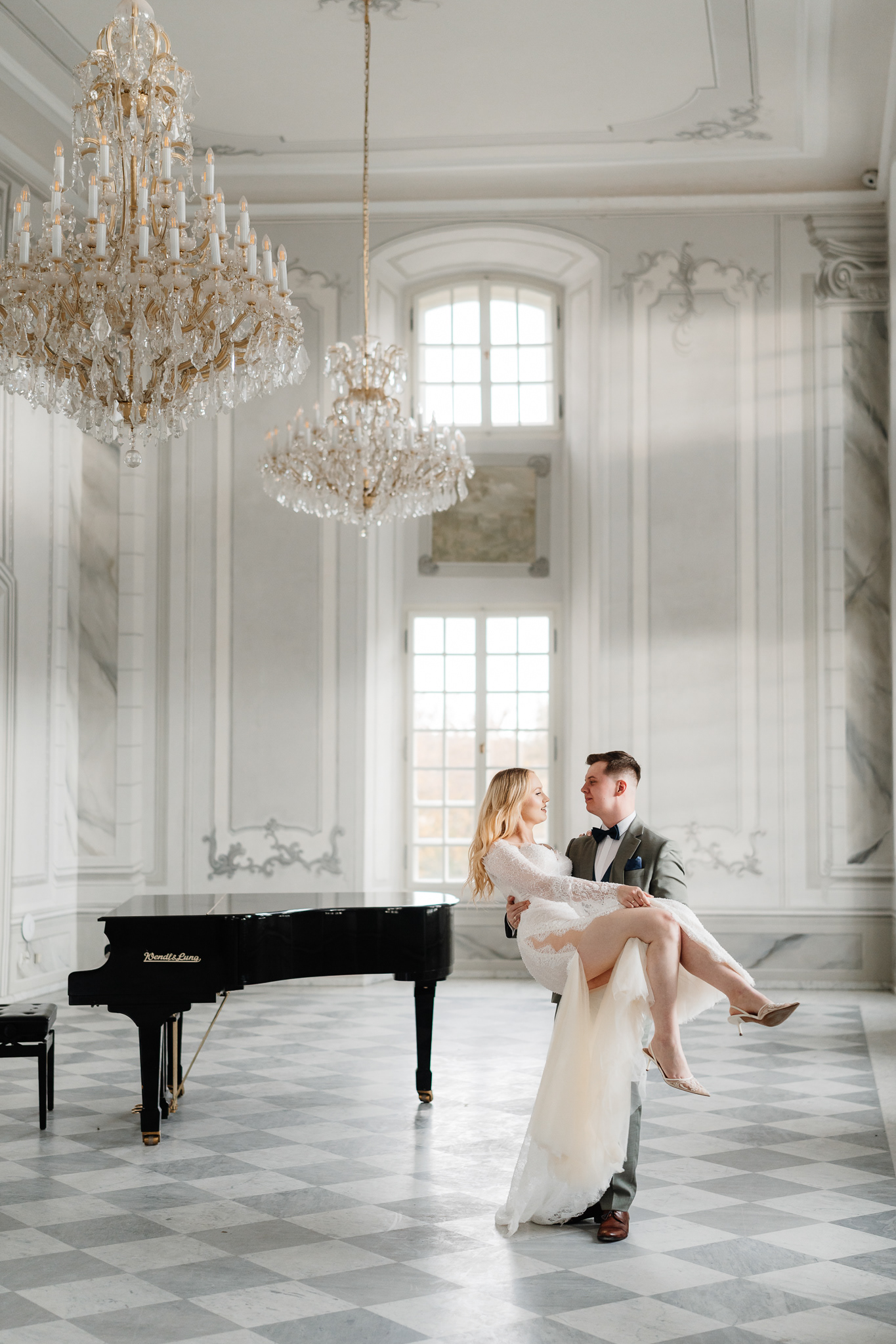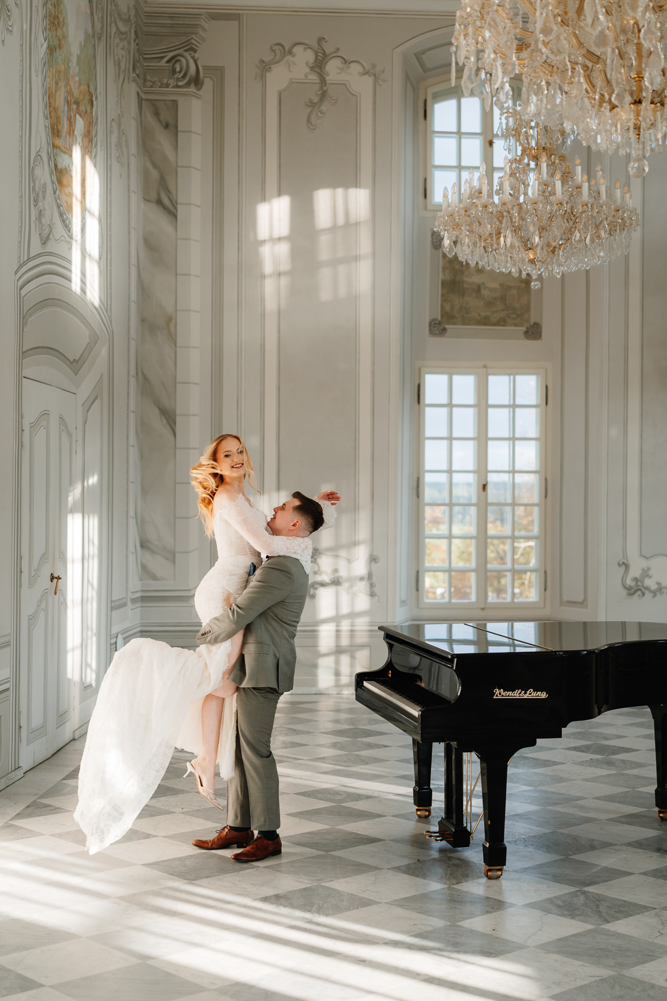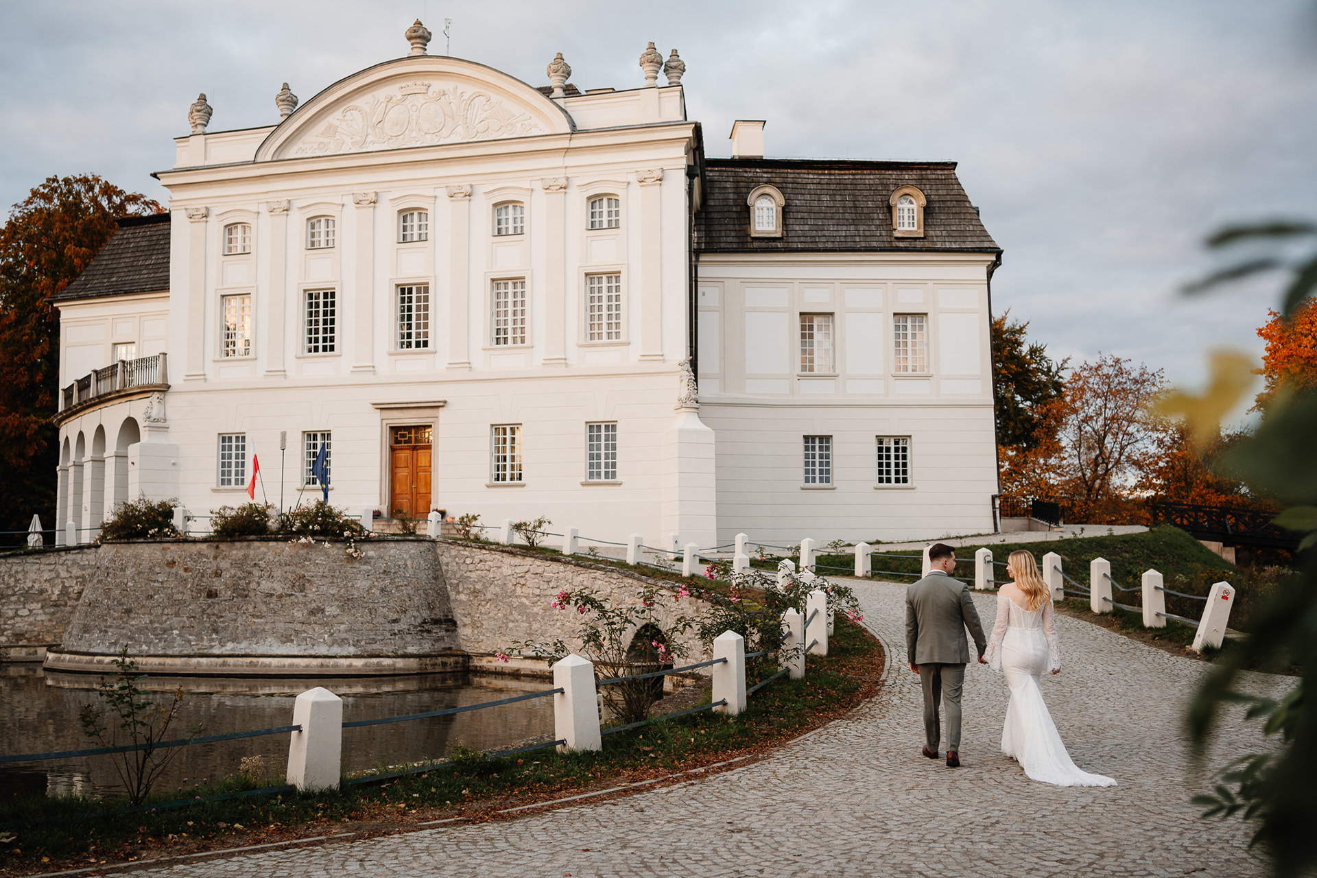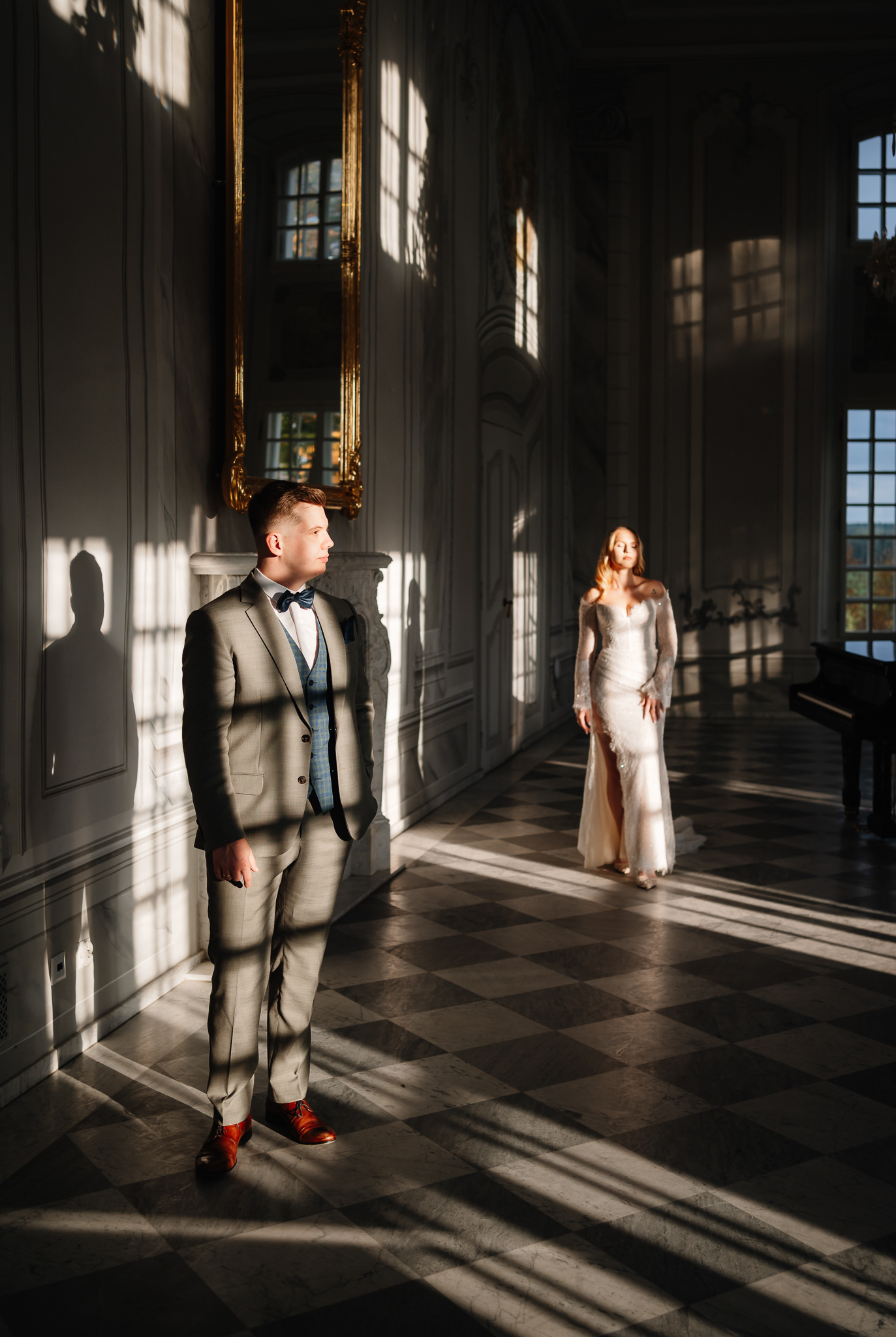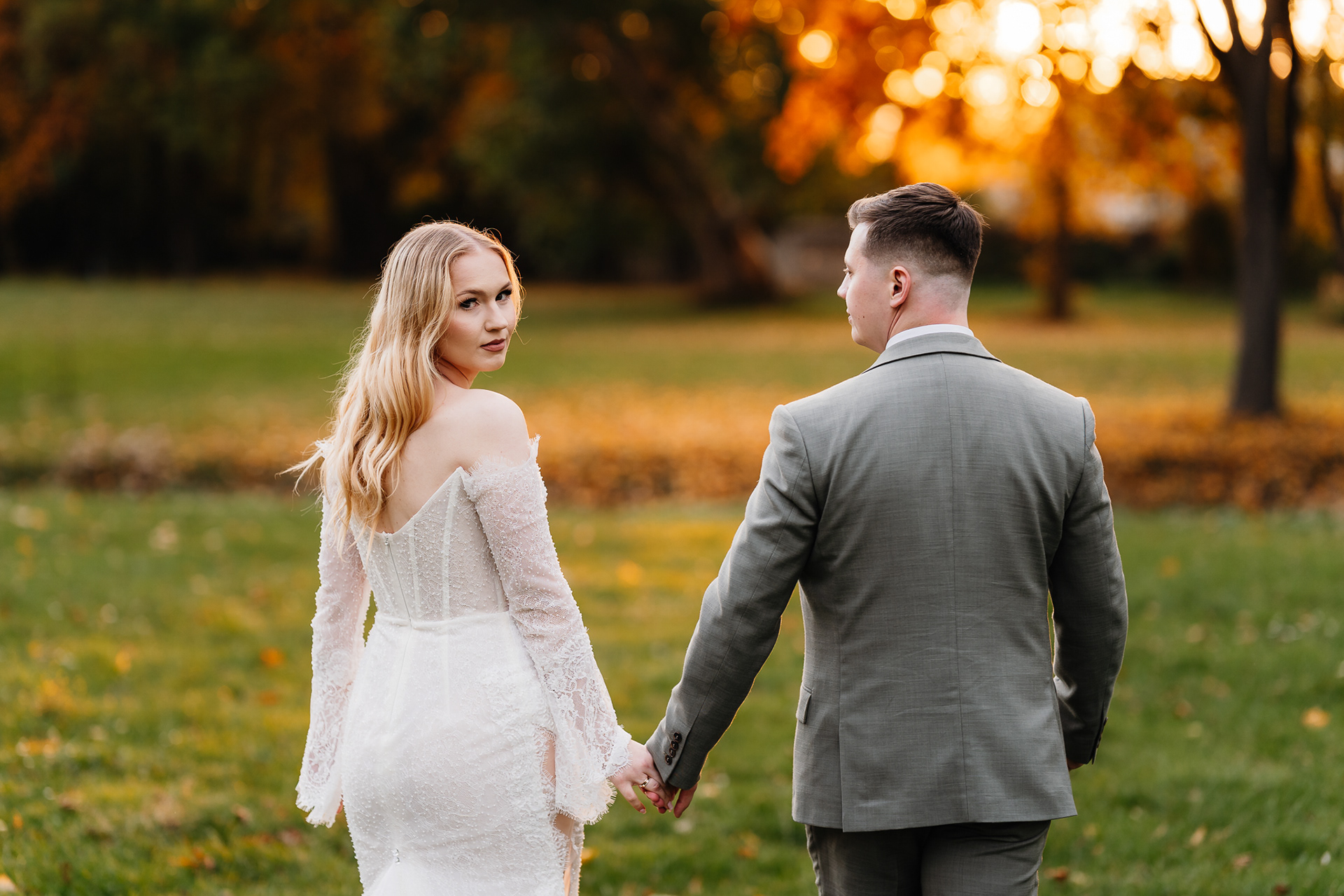 Wyjątkowa sala balowa z fortepianem, eleganckie wnętrza i magiczne światło jesiennego zachodu słońca stworzyły idealną scenerię do niepowtarzalnych zdjęć ślubnych.