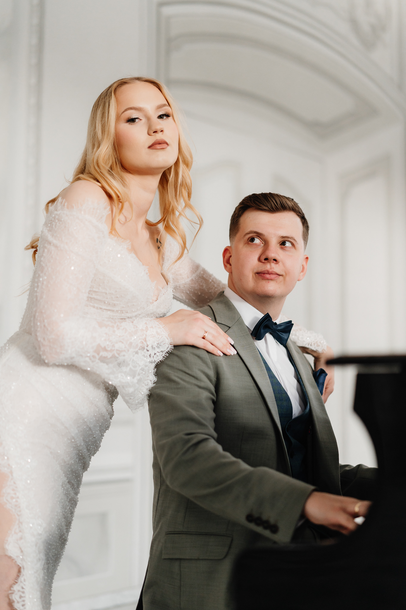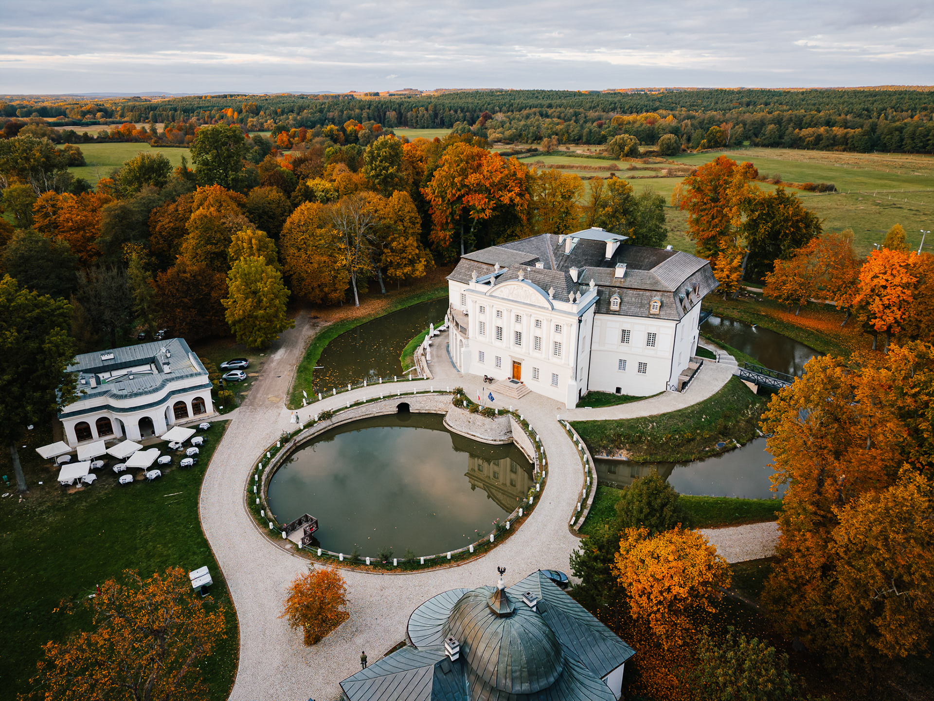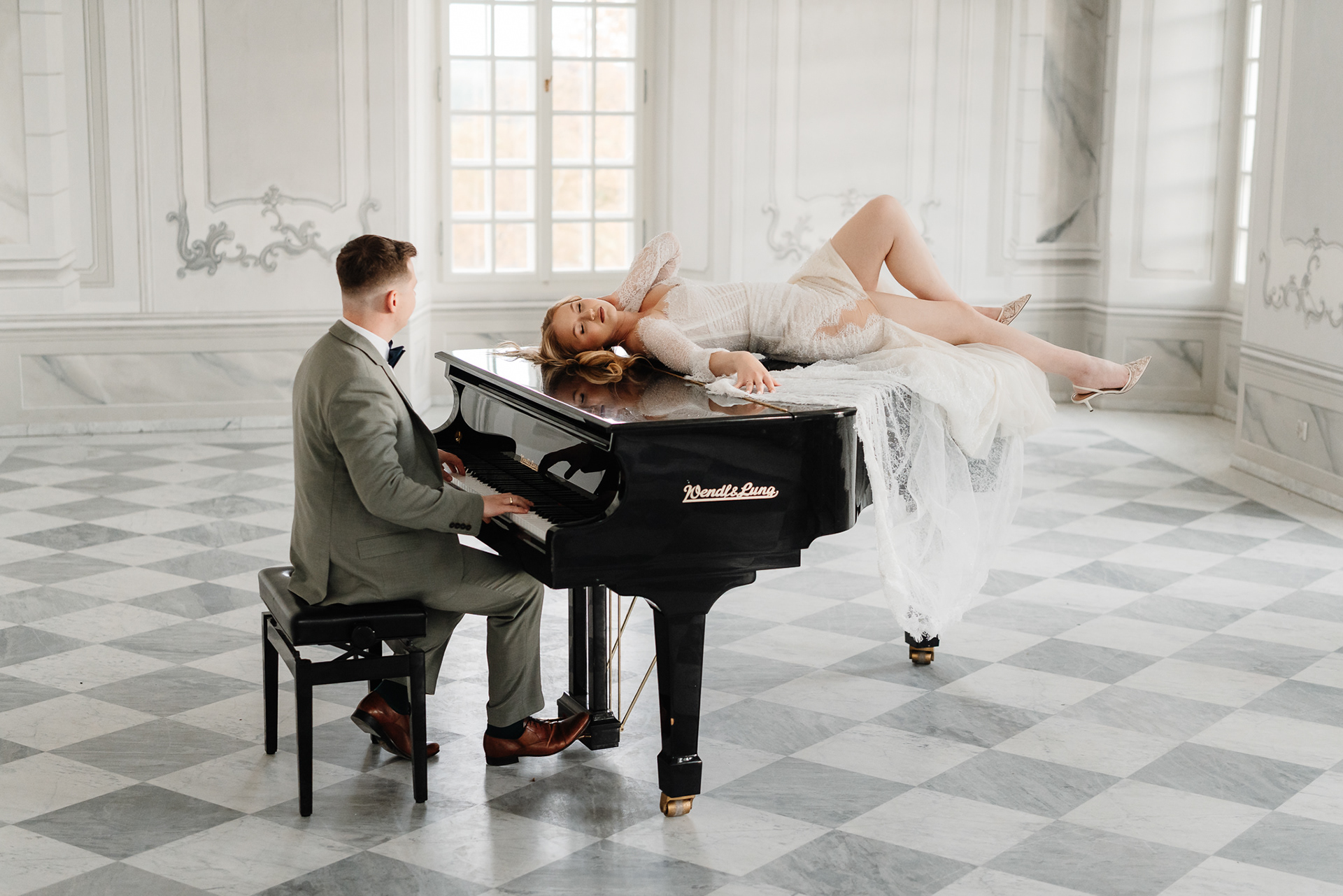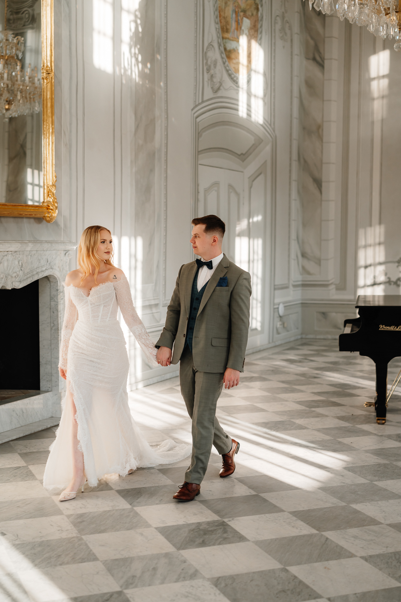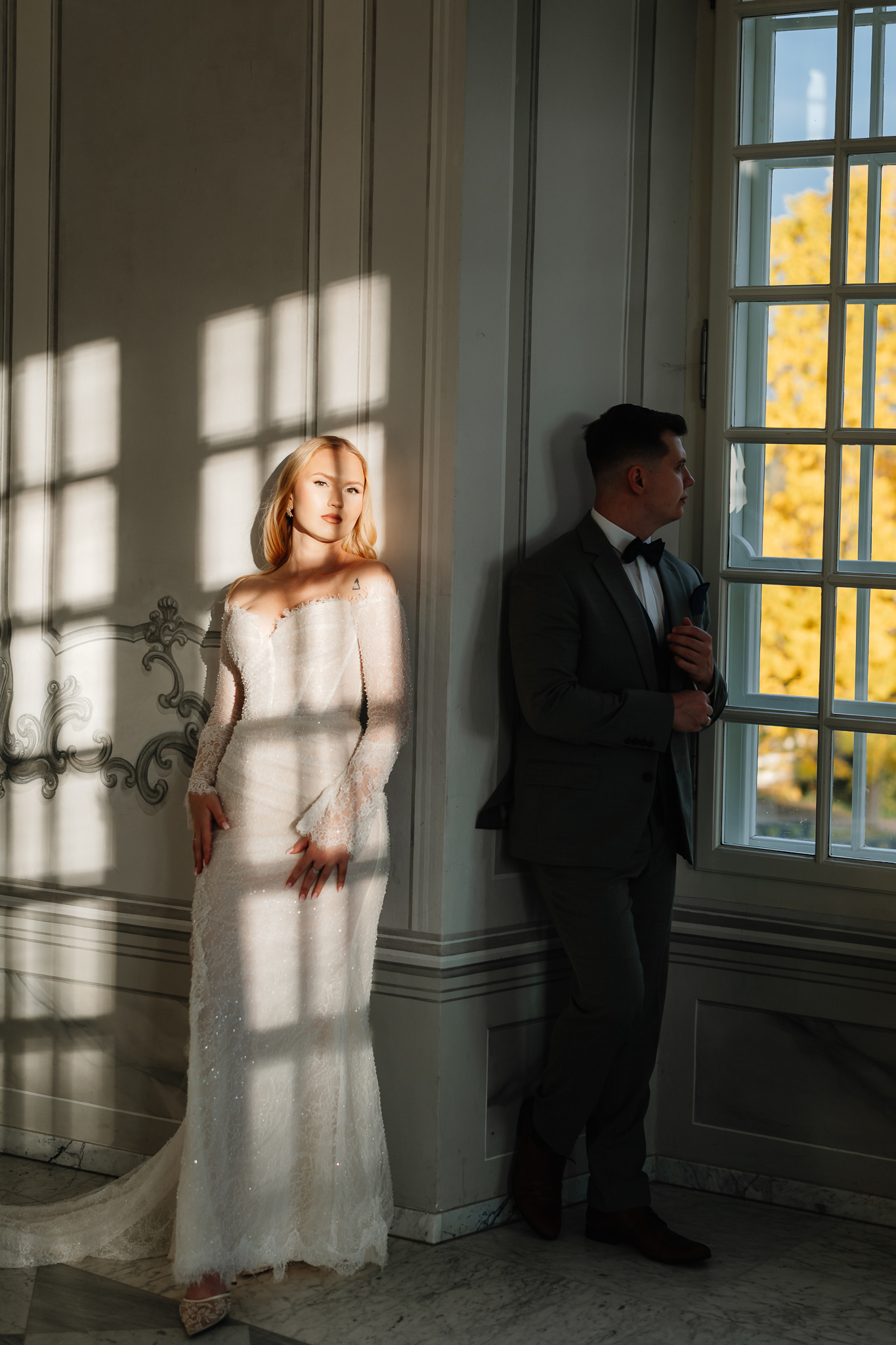 Wyjątkowa sala balowa z fortepianem, eleganckie wnętrza i magiczne światło jesiennego zachodu słońca stworzyły idealną scenerię do niepowtarzalnych zdjęć ślubnych.