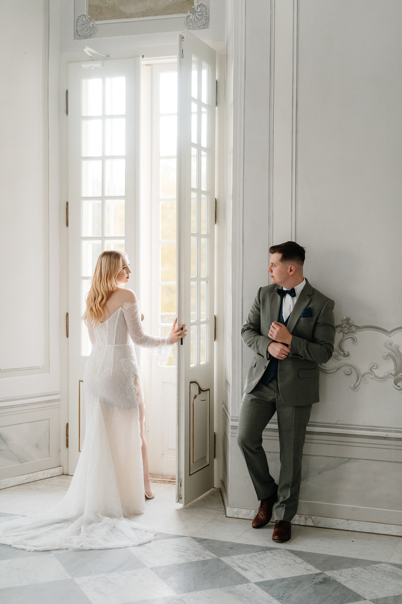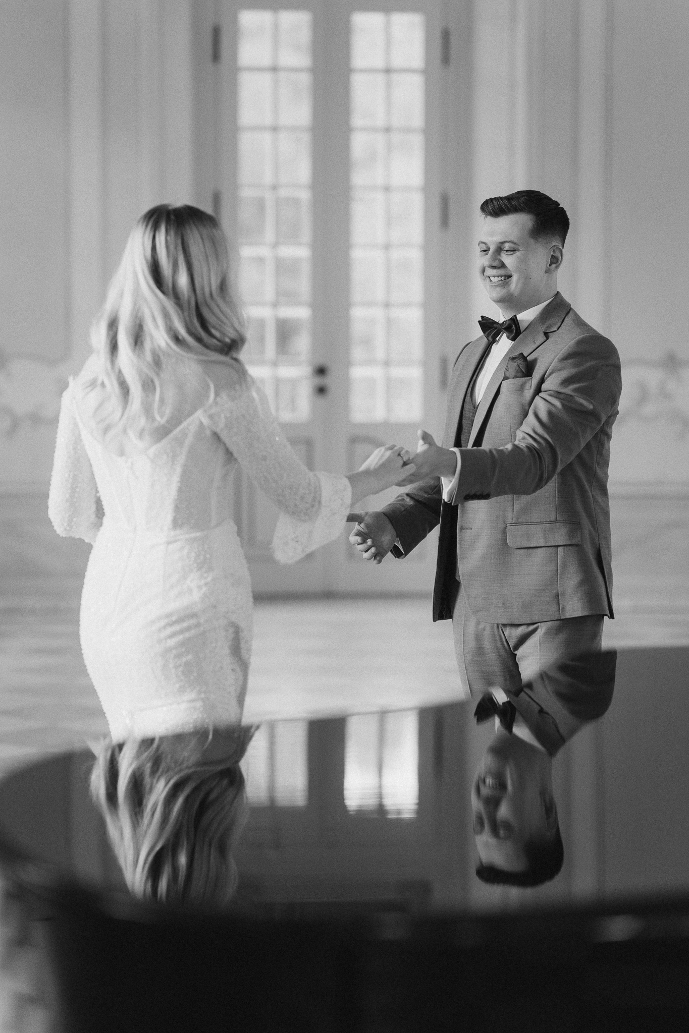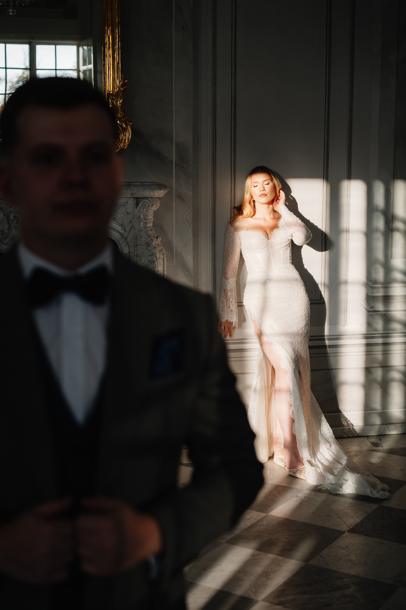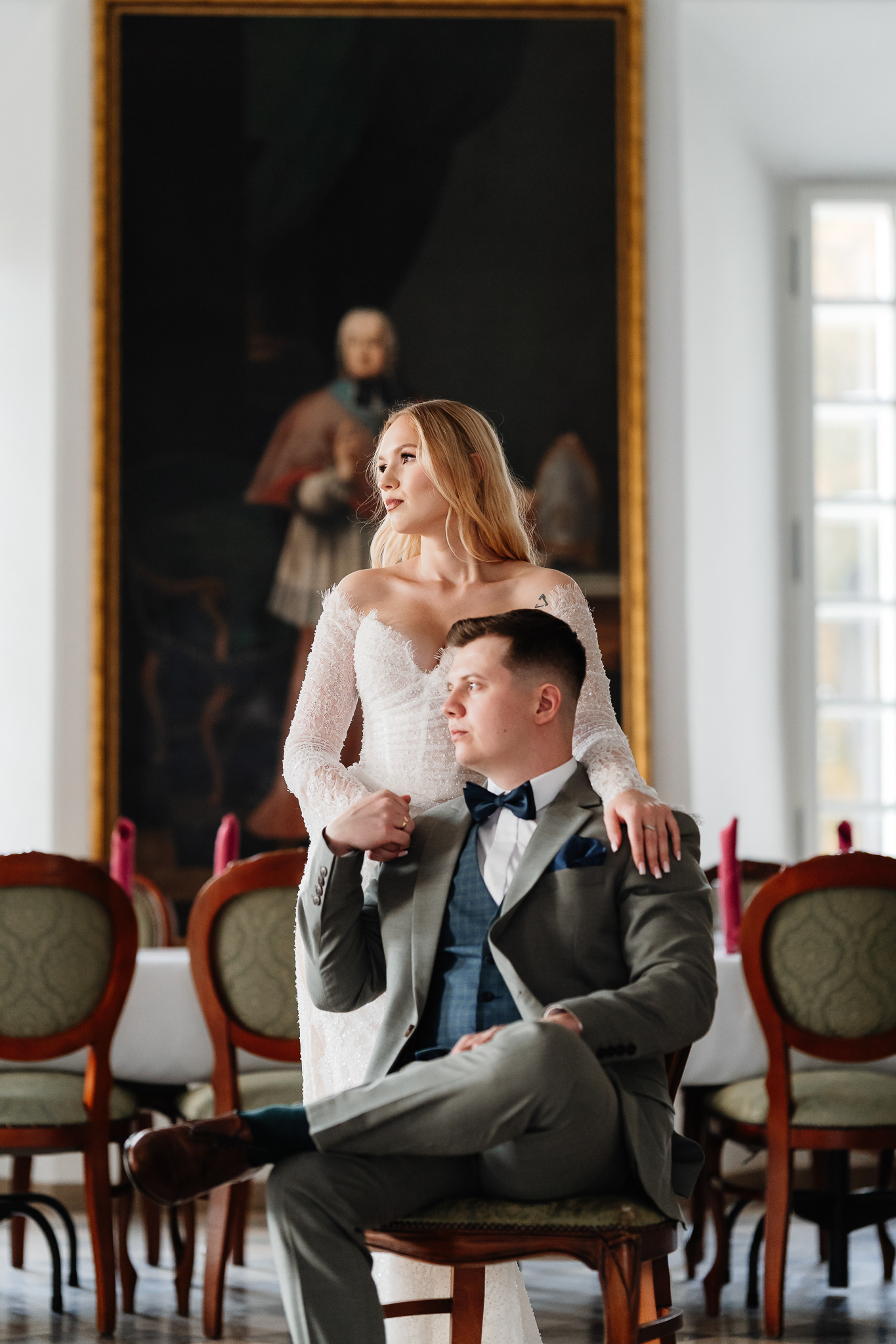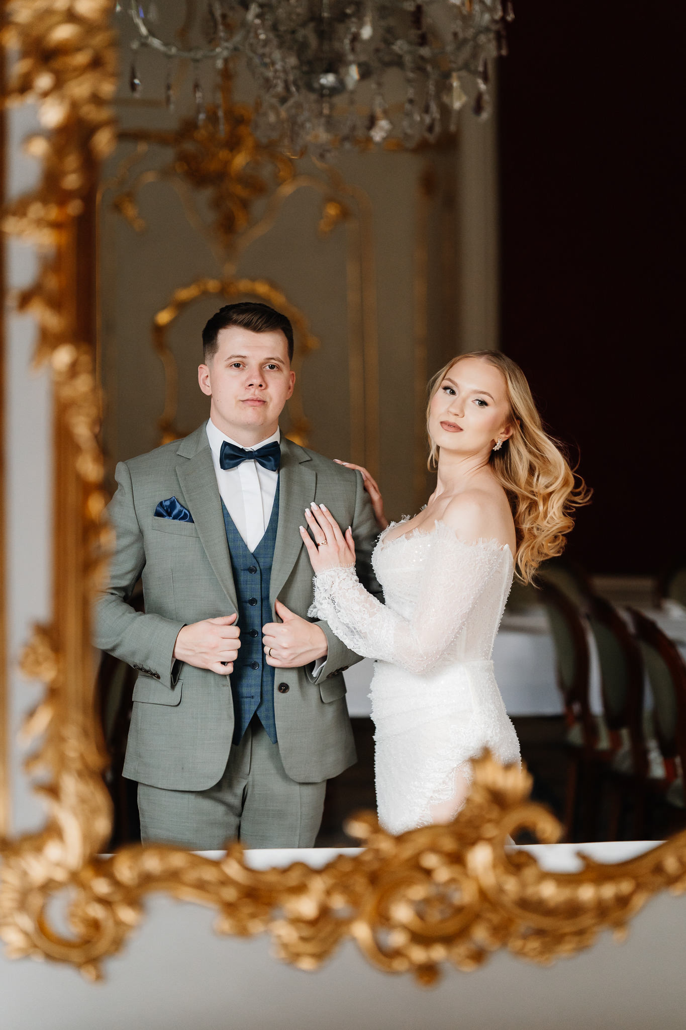 Wyjątkowa sala balowa z fortepianem, eleganckie wnętrza i magiczne światło jesiennego zachodu słońca stworzyły idealną scenerię do niepowtarzalnych zdjęć ślubnych.