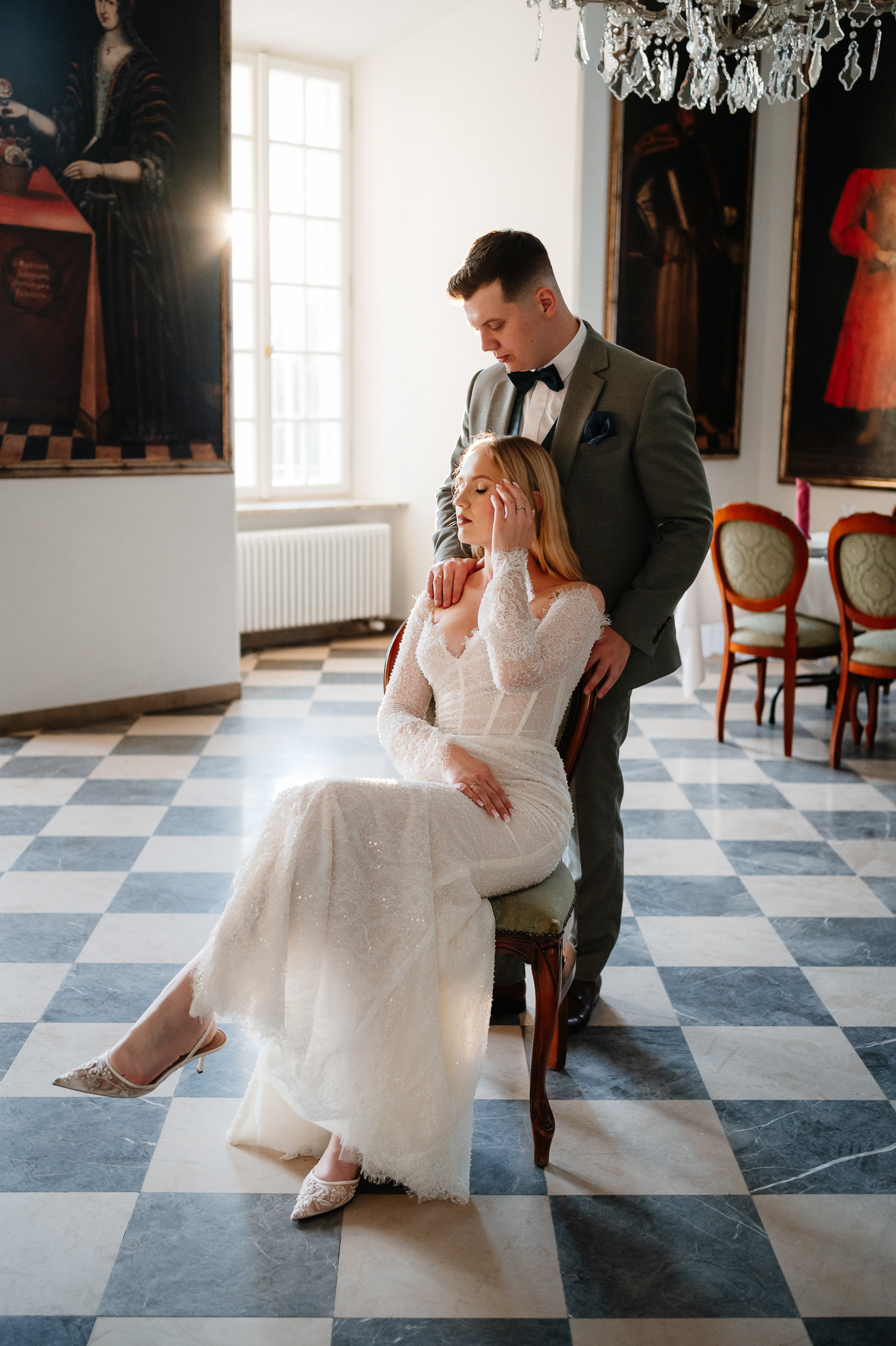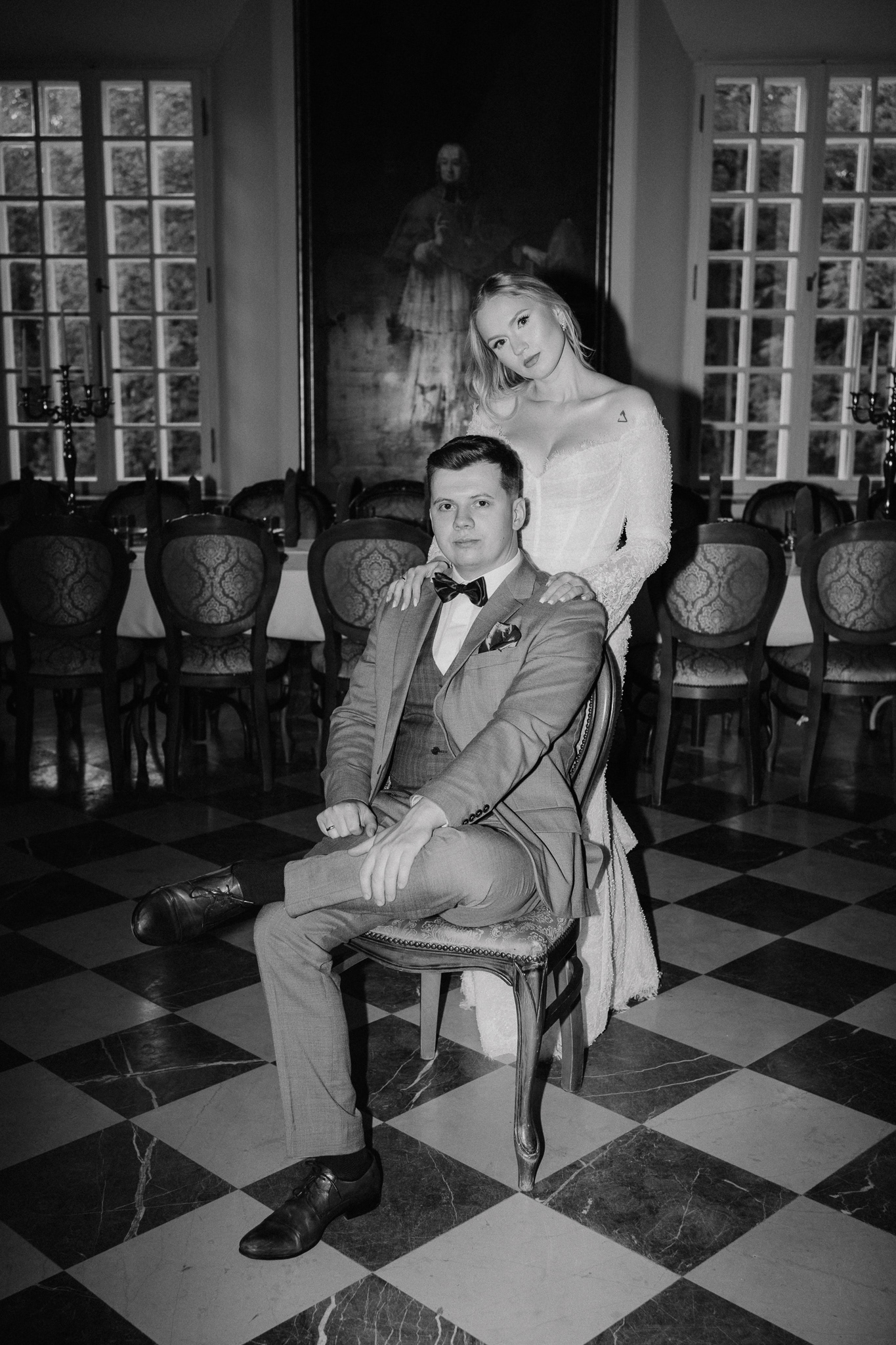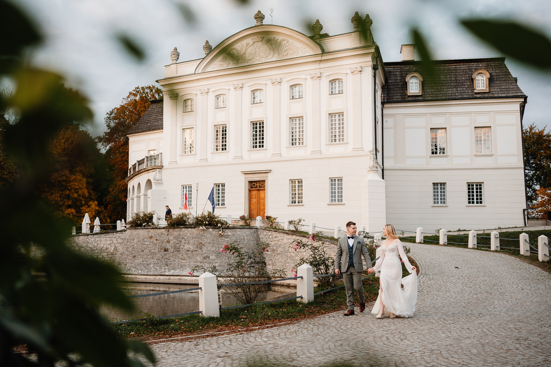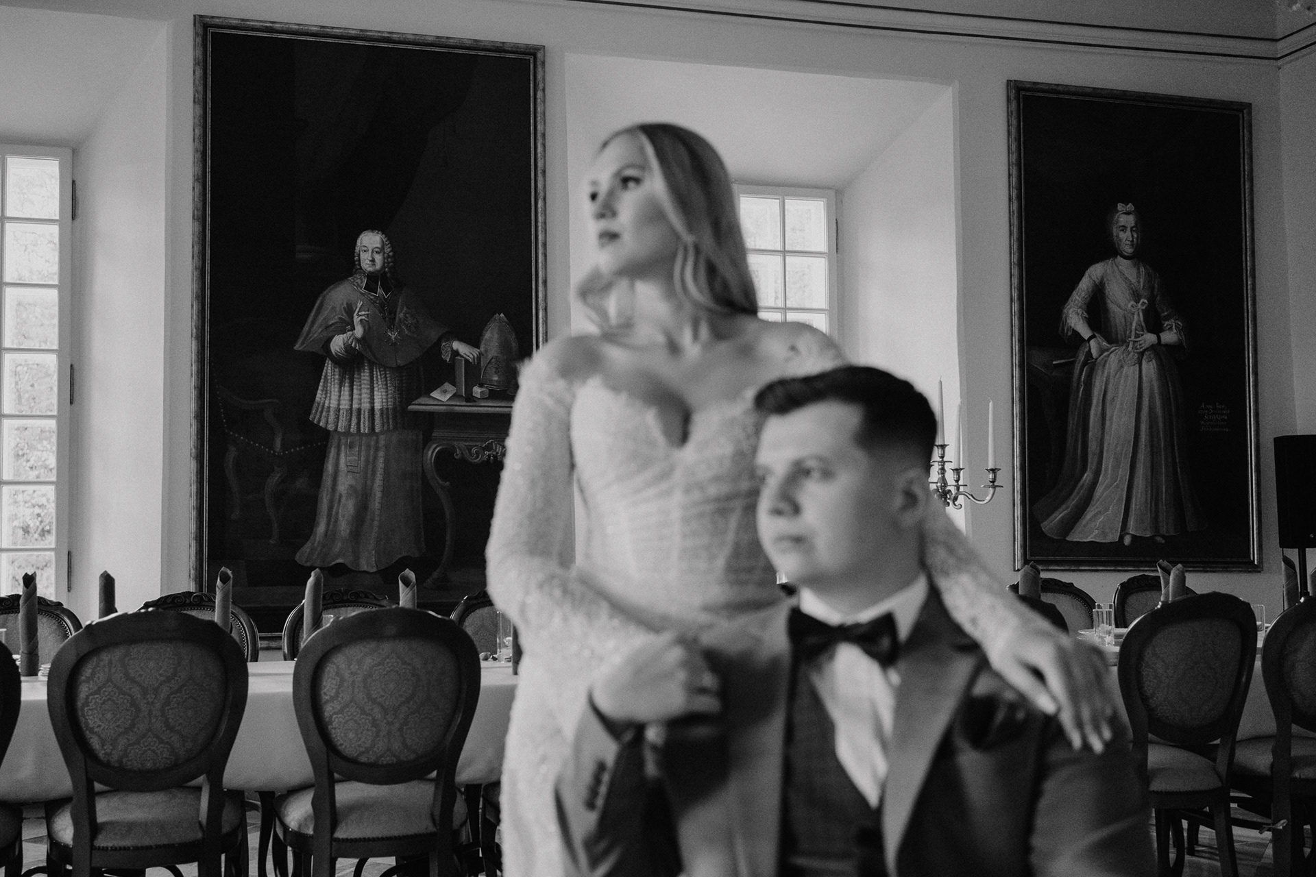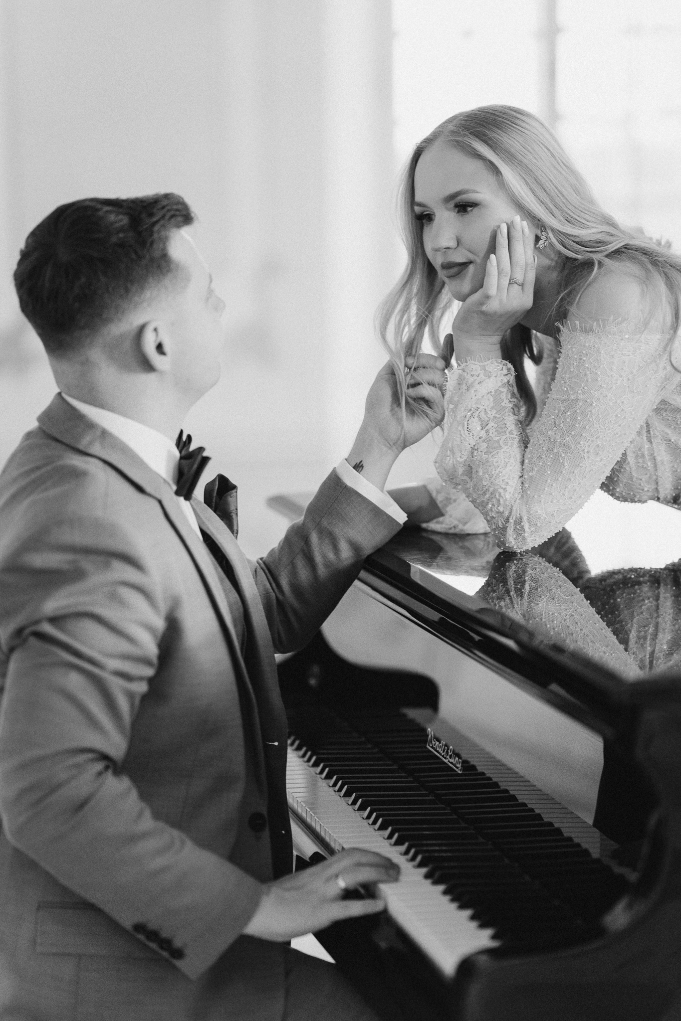 Wyjątkowa sala balowa z fortepianem, eleganckie wnętrza i magiczne światło jesiennego zachodu słońca stworzyły idealną scenerię do niepowtarzalnych zdjęć ślubnych.