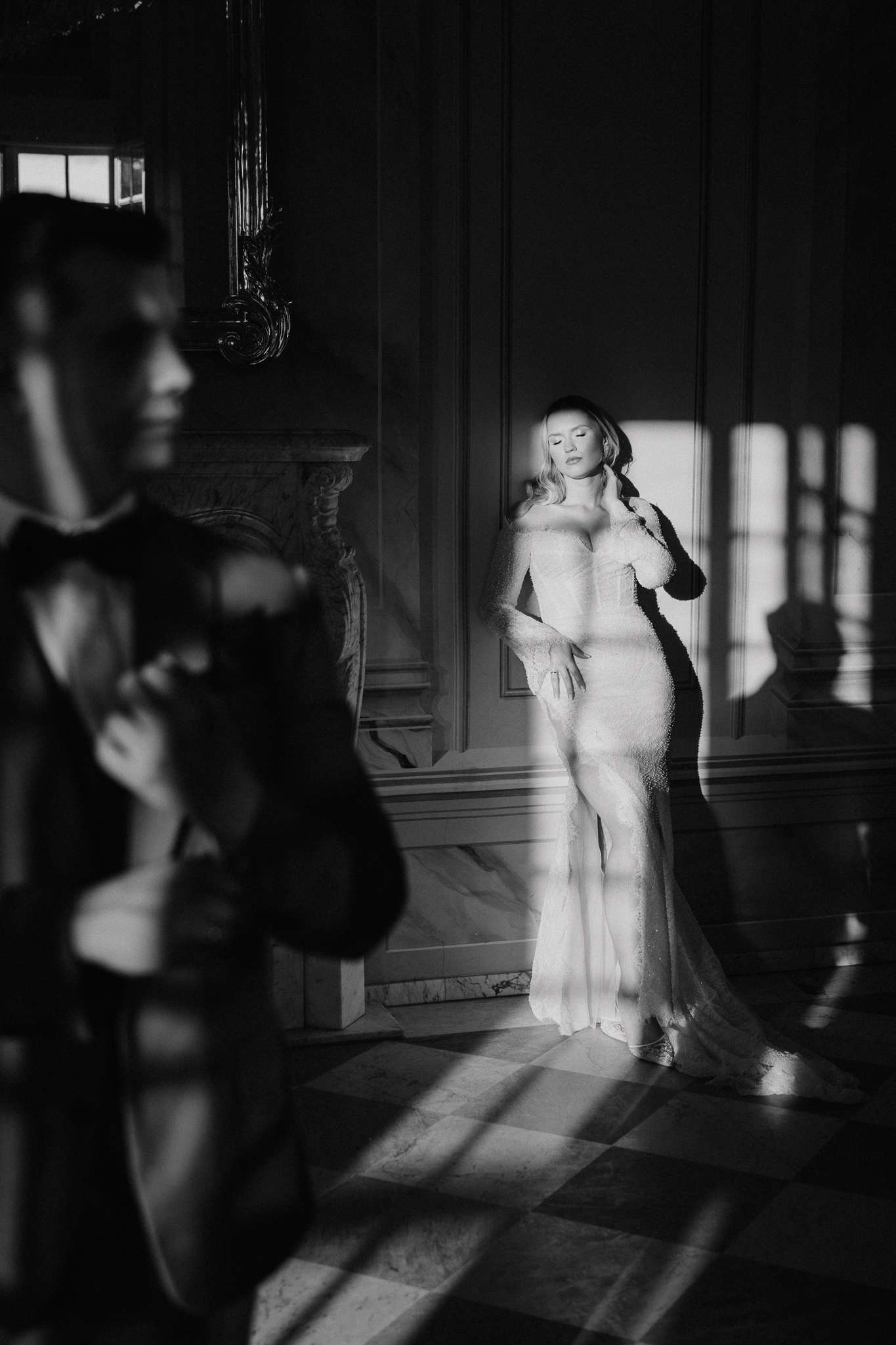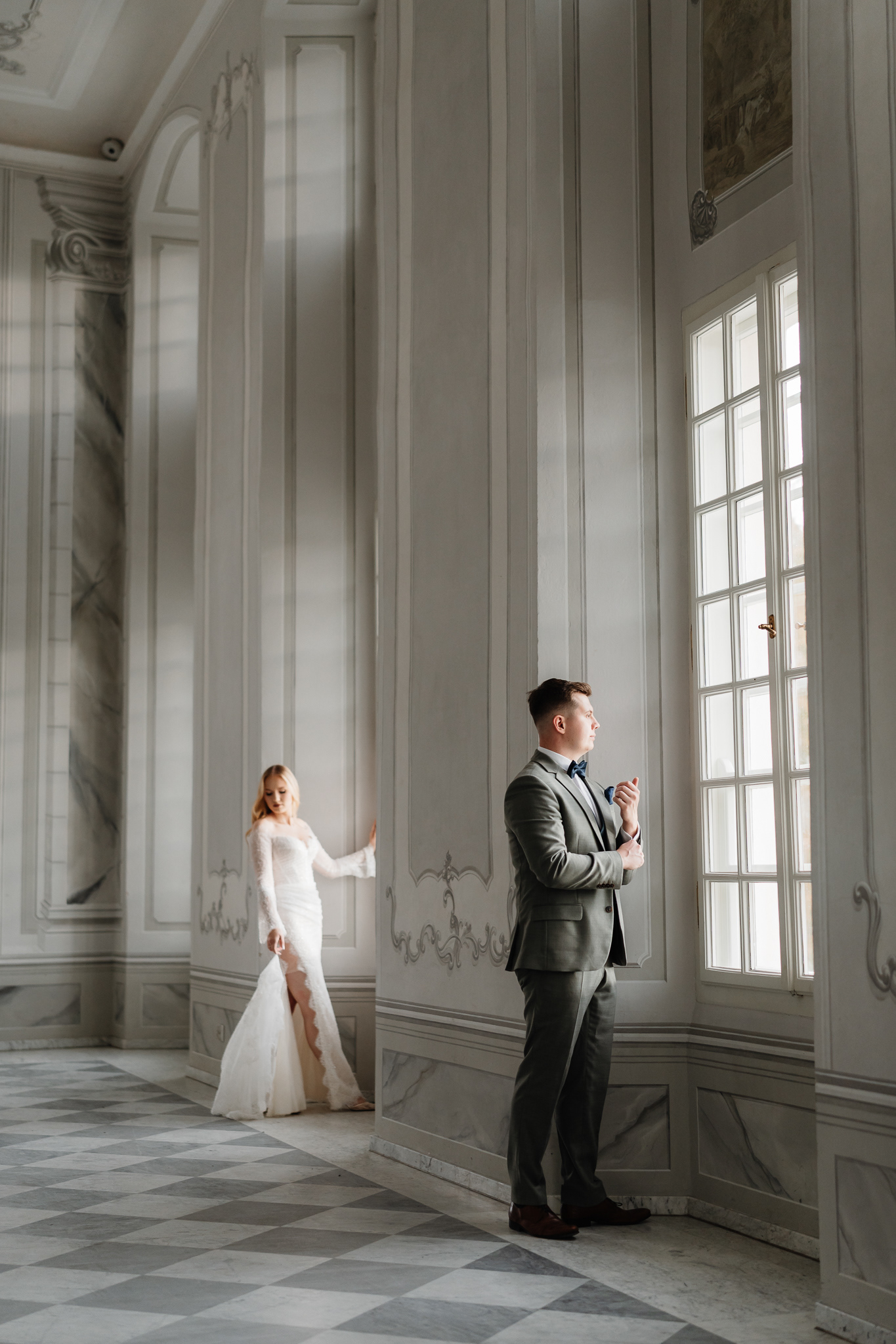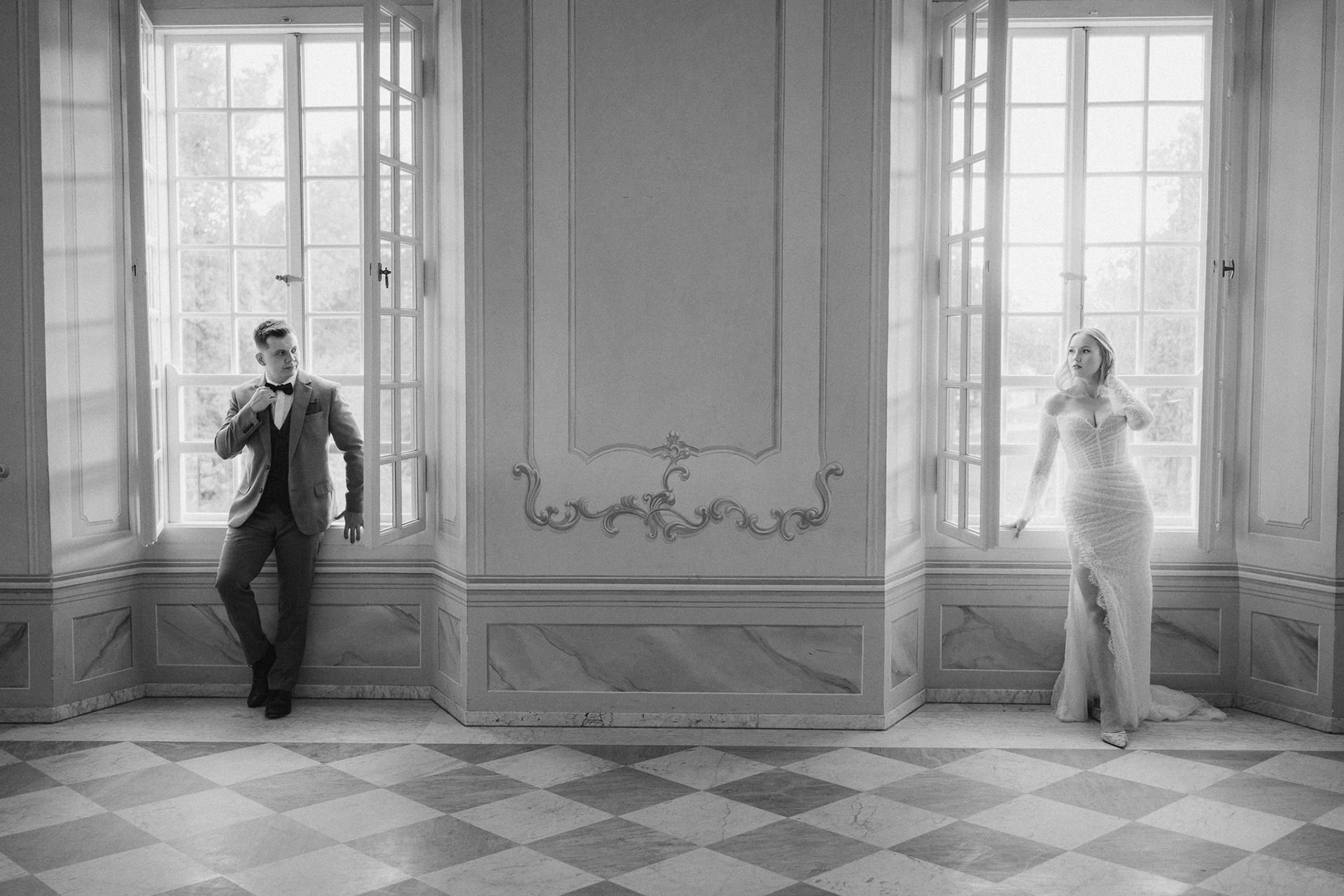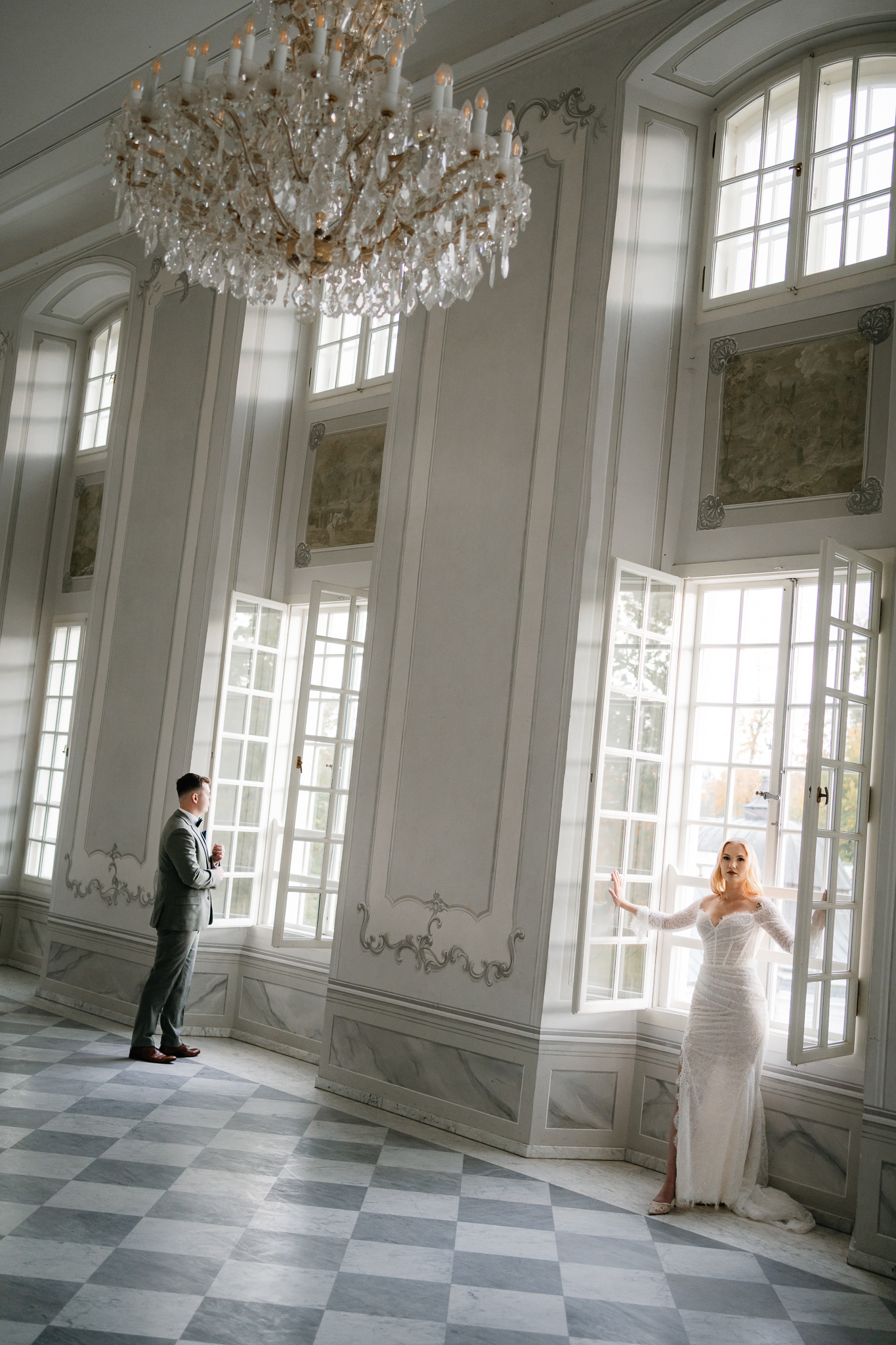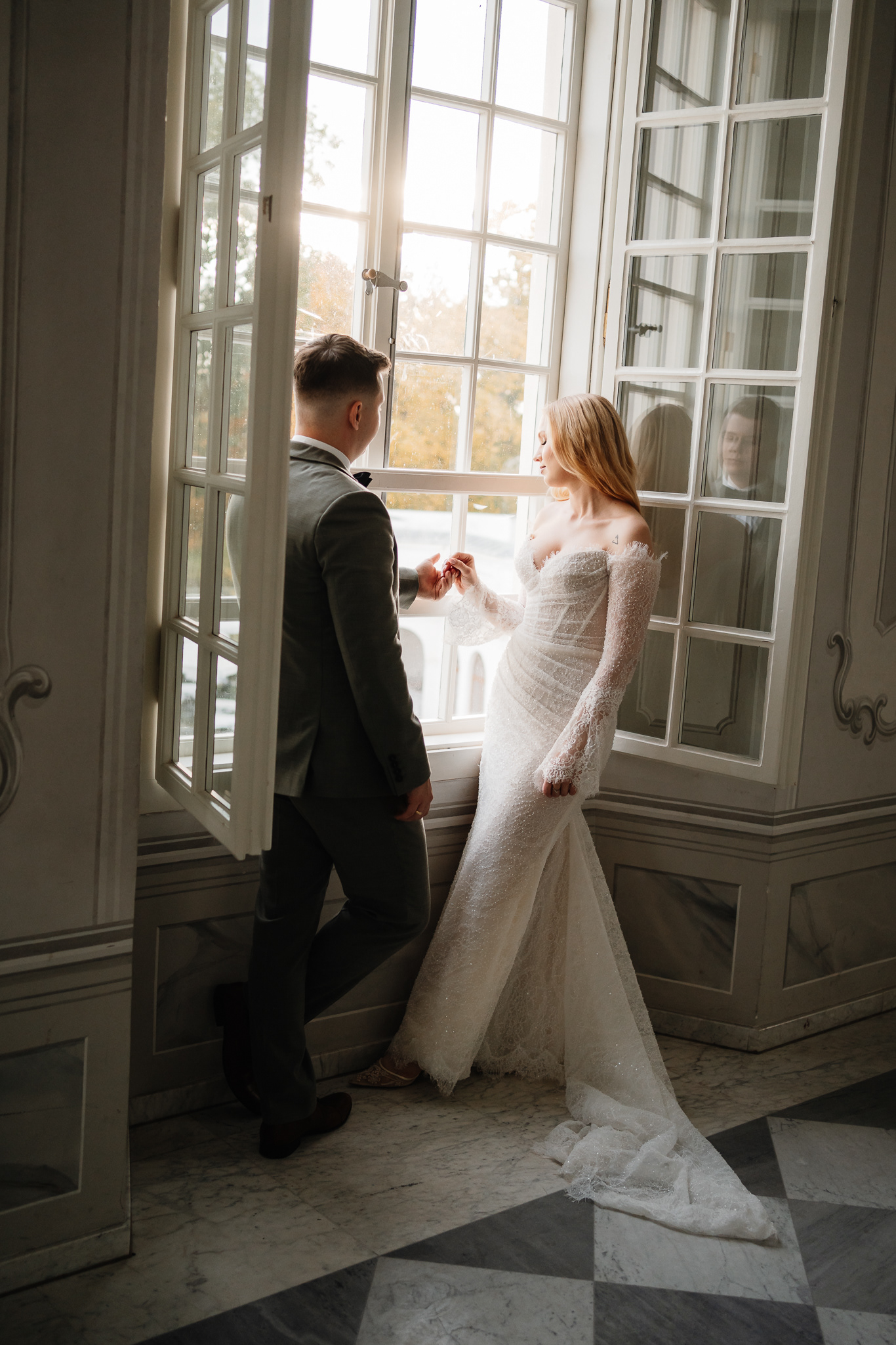 Wyjątkowa sala balowa z fortepianem, eleganckie wnętrza i magiczne światło jesiennego zachodu słońca stworzyły idealną scenerię do niepowtarzalnych zdjęć ślubnych.