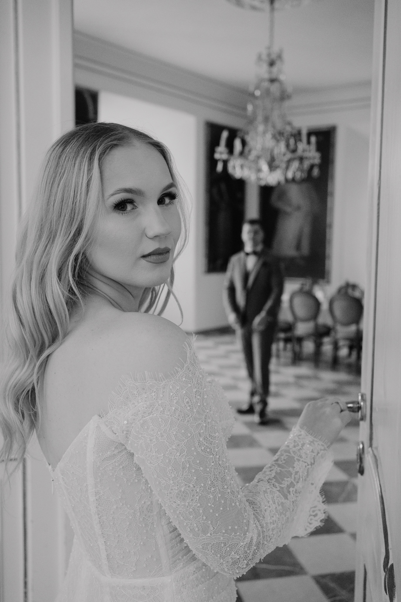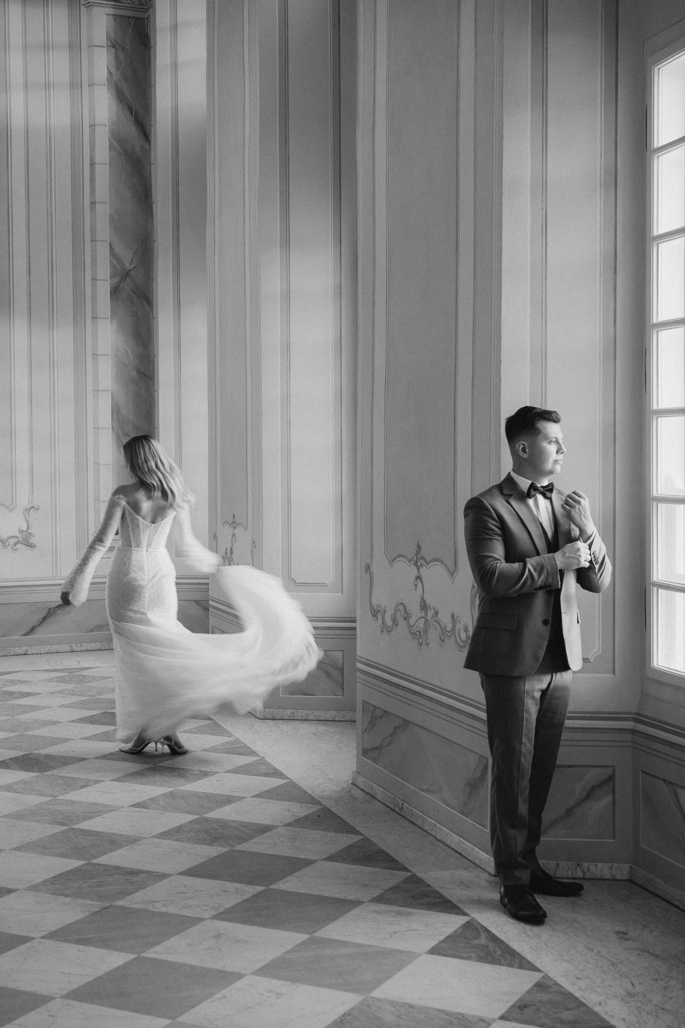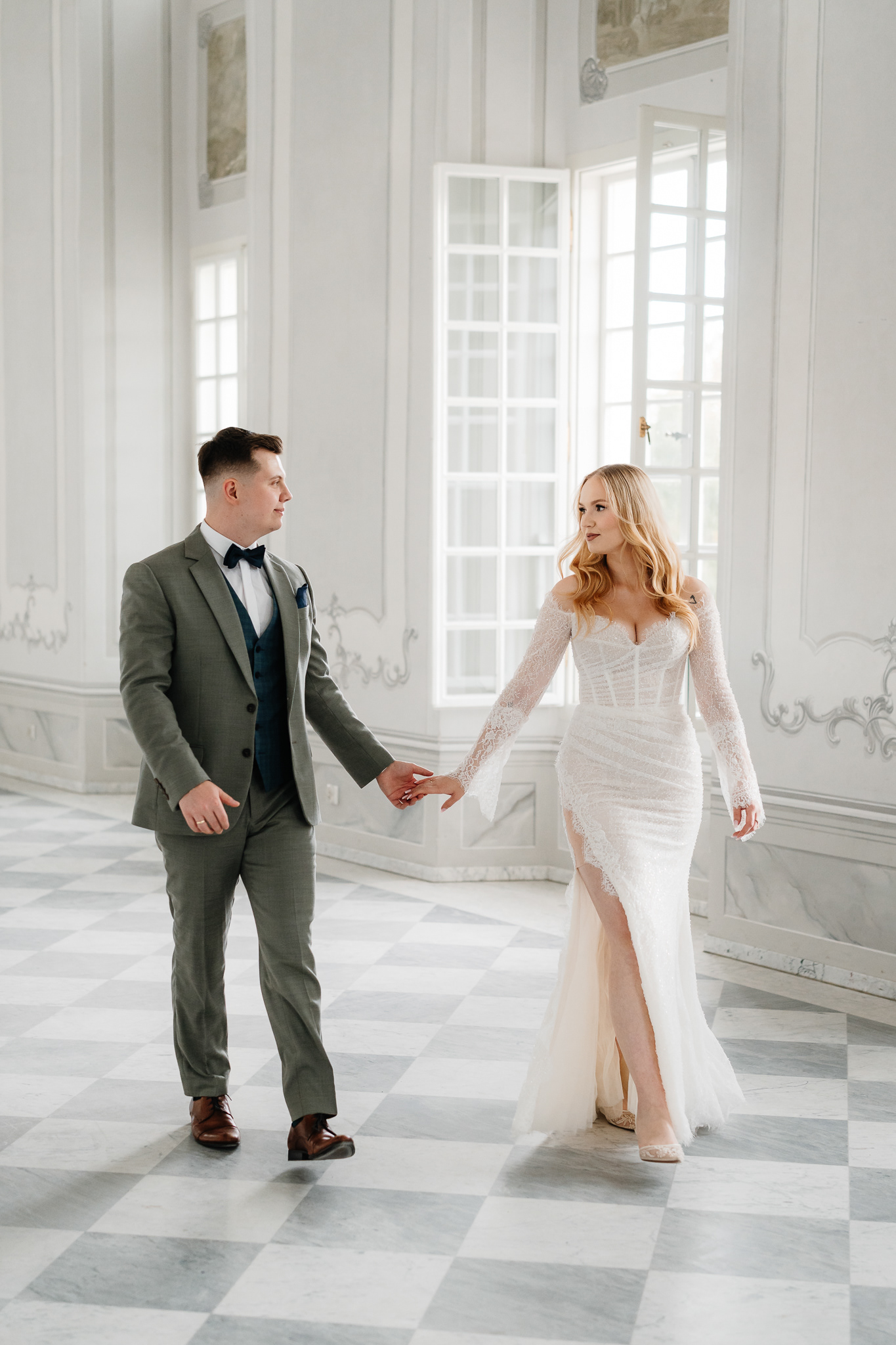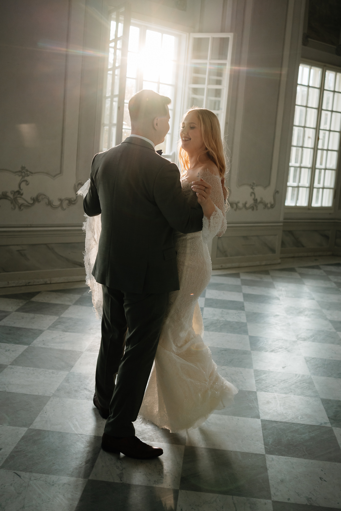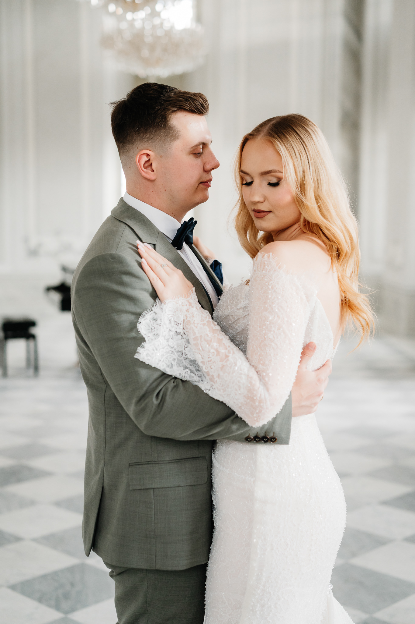Wyjątkowa sala balowa z fortepianem, eleganckie wnętrza i magiczne światło jesiennego zachodu słońca stworzyły idealną scenerię do niepowtarzalnych zdjęć ślubnych.