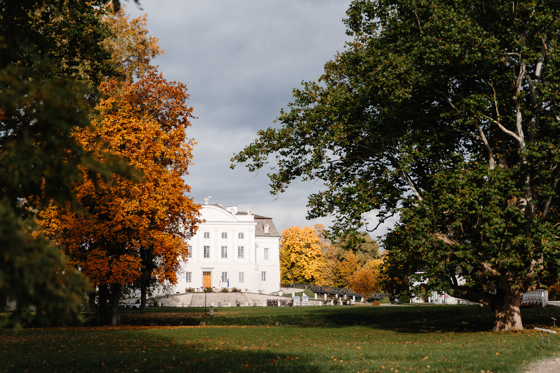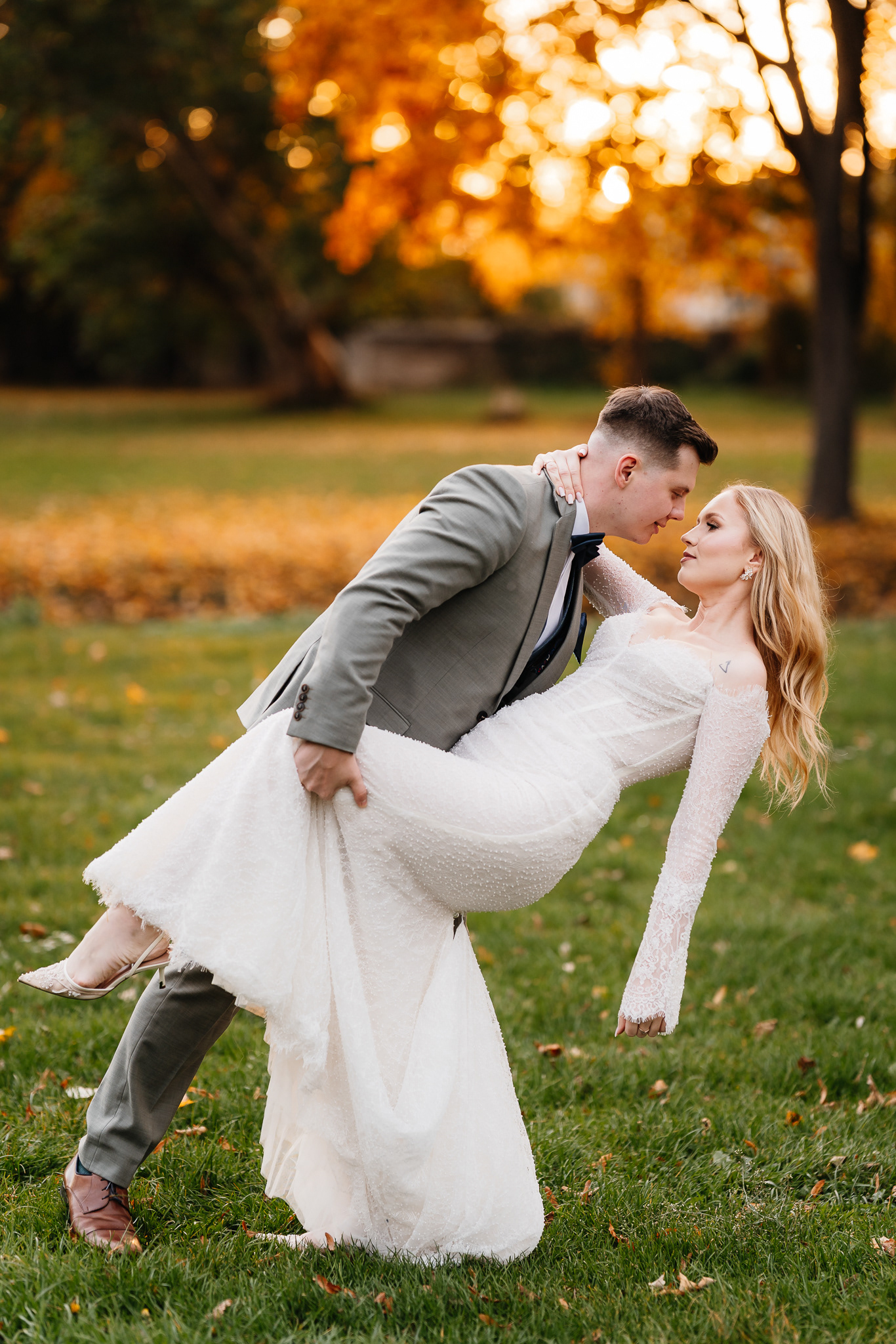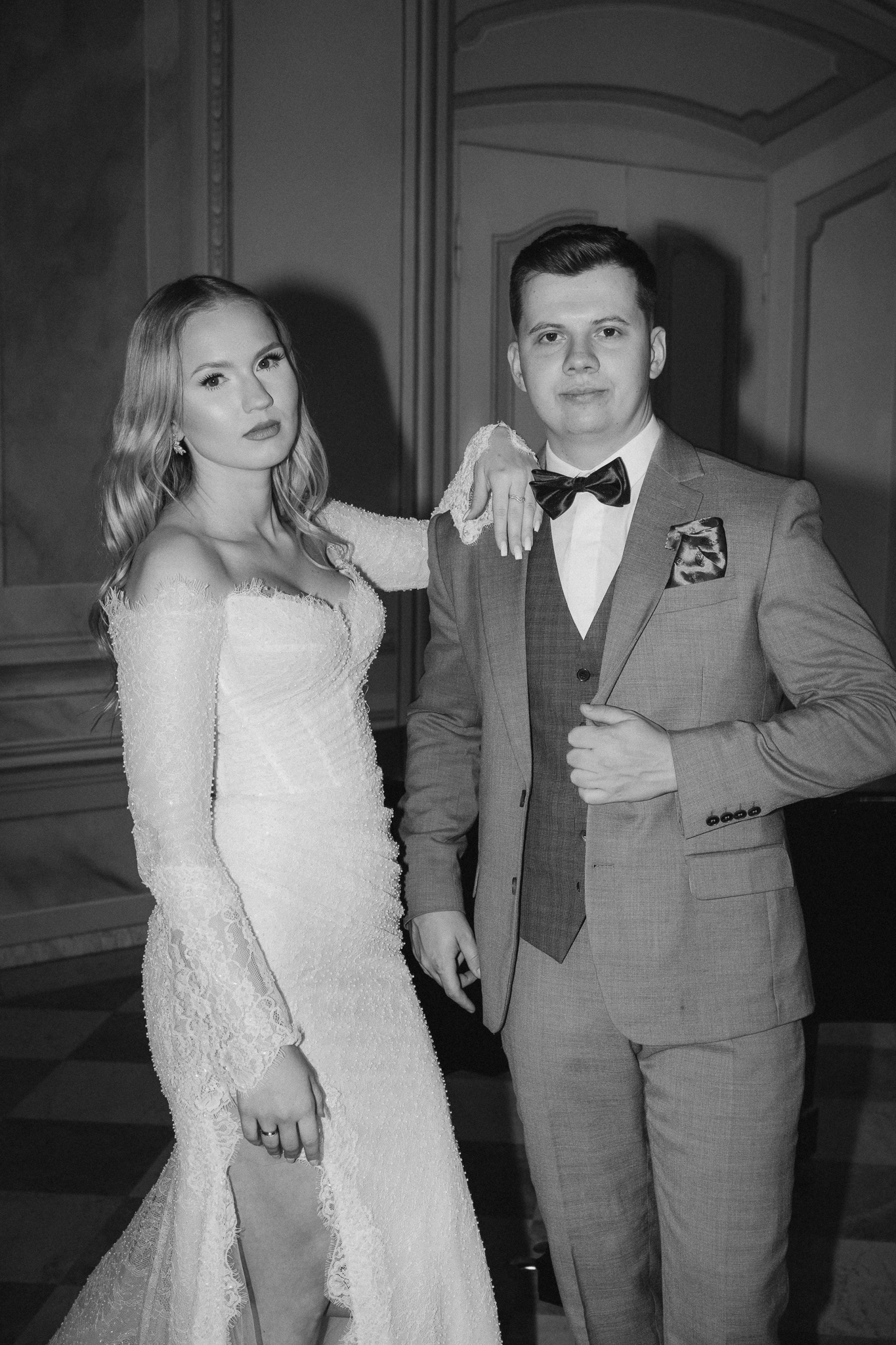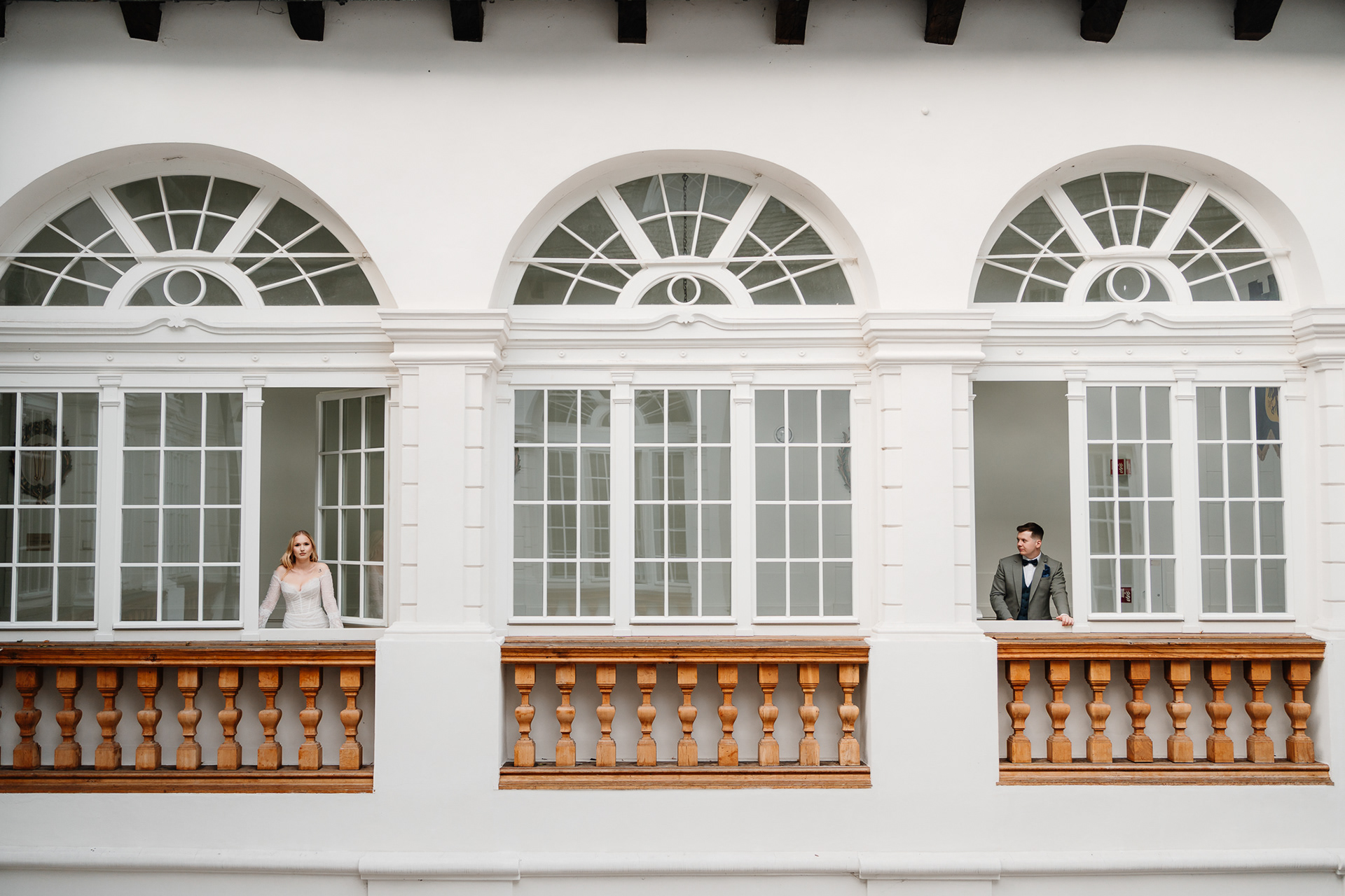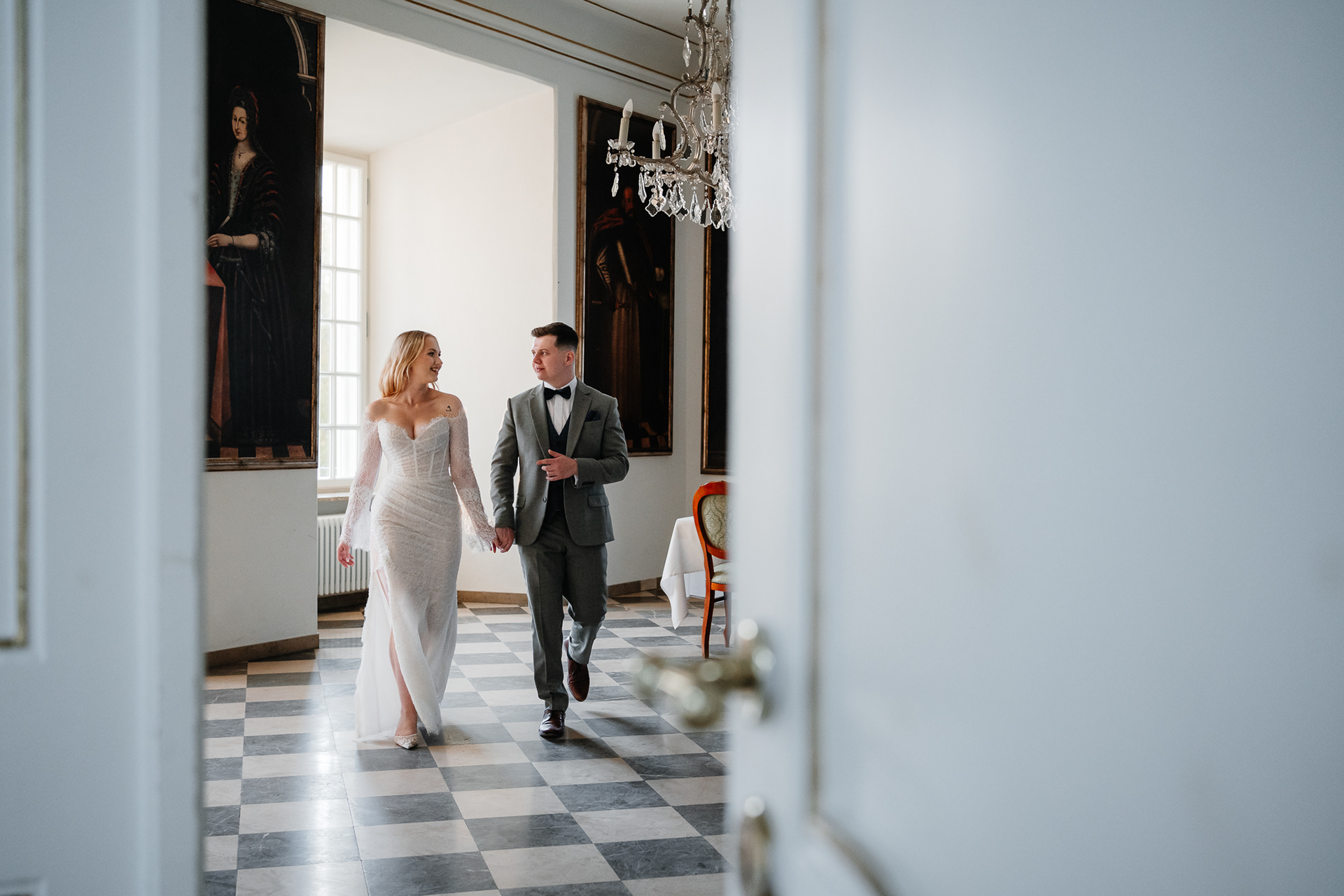 Wyjątkowa sala balowa z fortepianem, eleganckie wnętrza i magiczne światło jesiennego zachodu słońca stworzyły idealną scenerię do niepowtarzalnych zdjęć ślubnych.