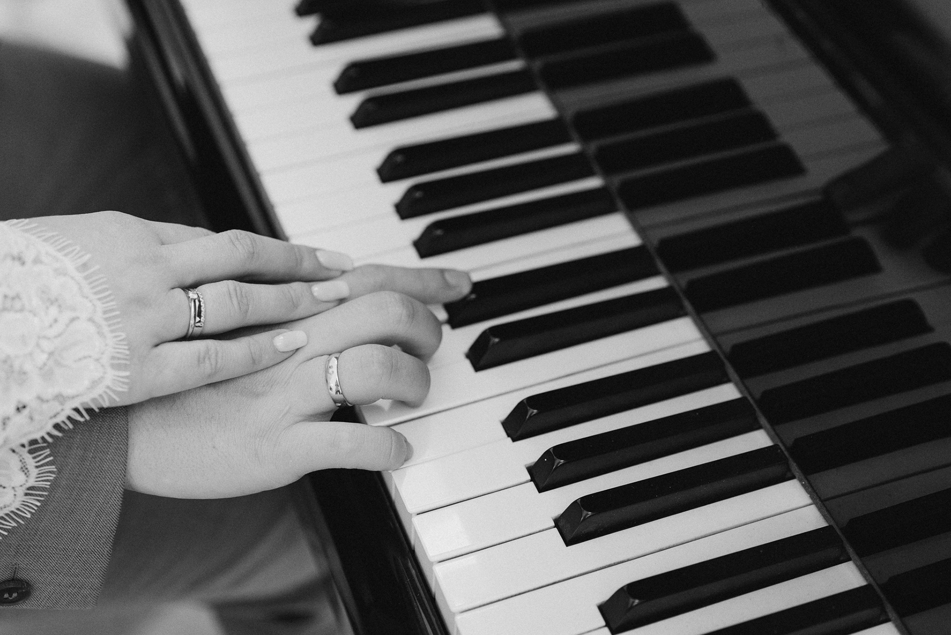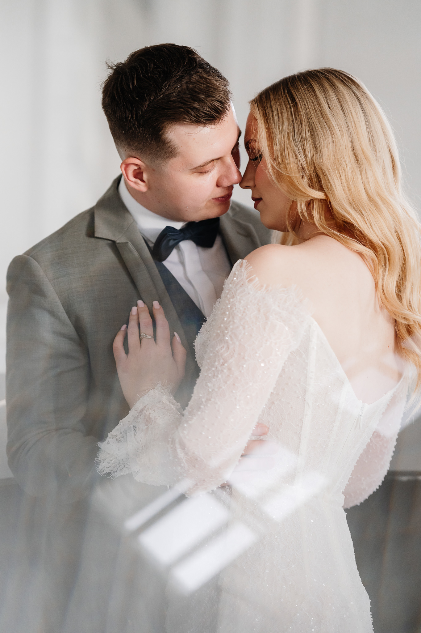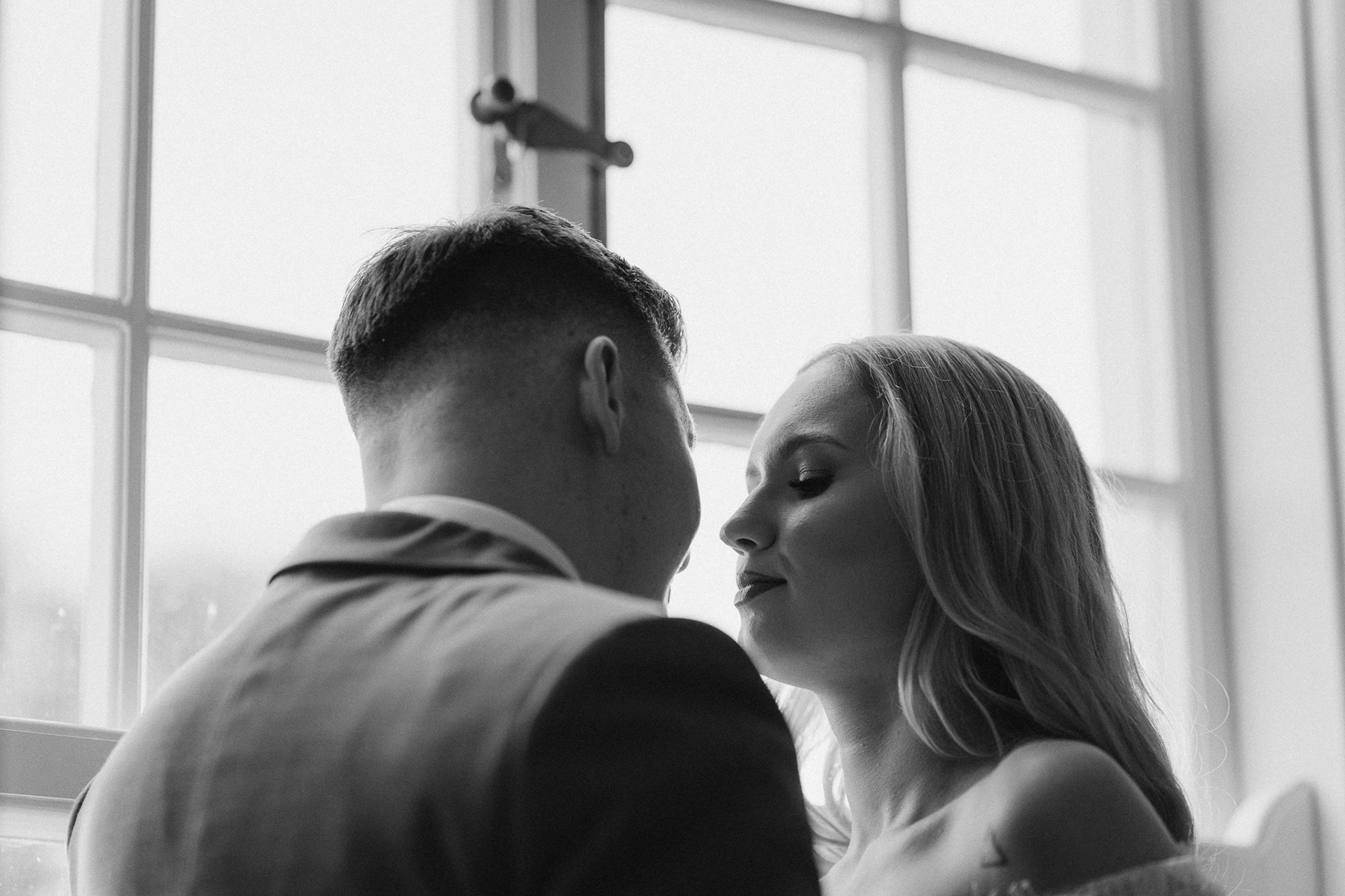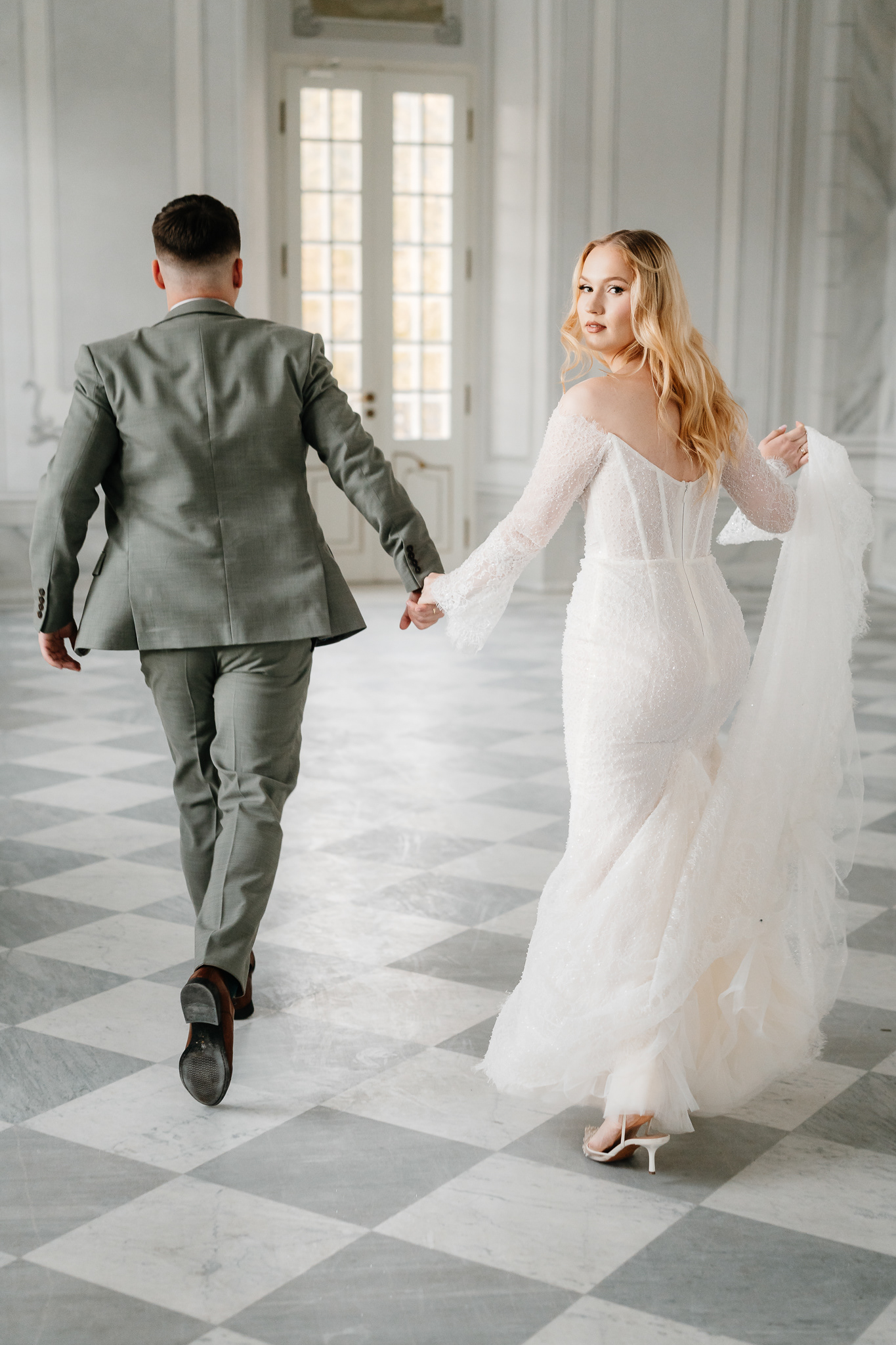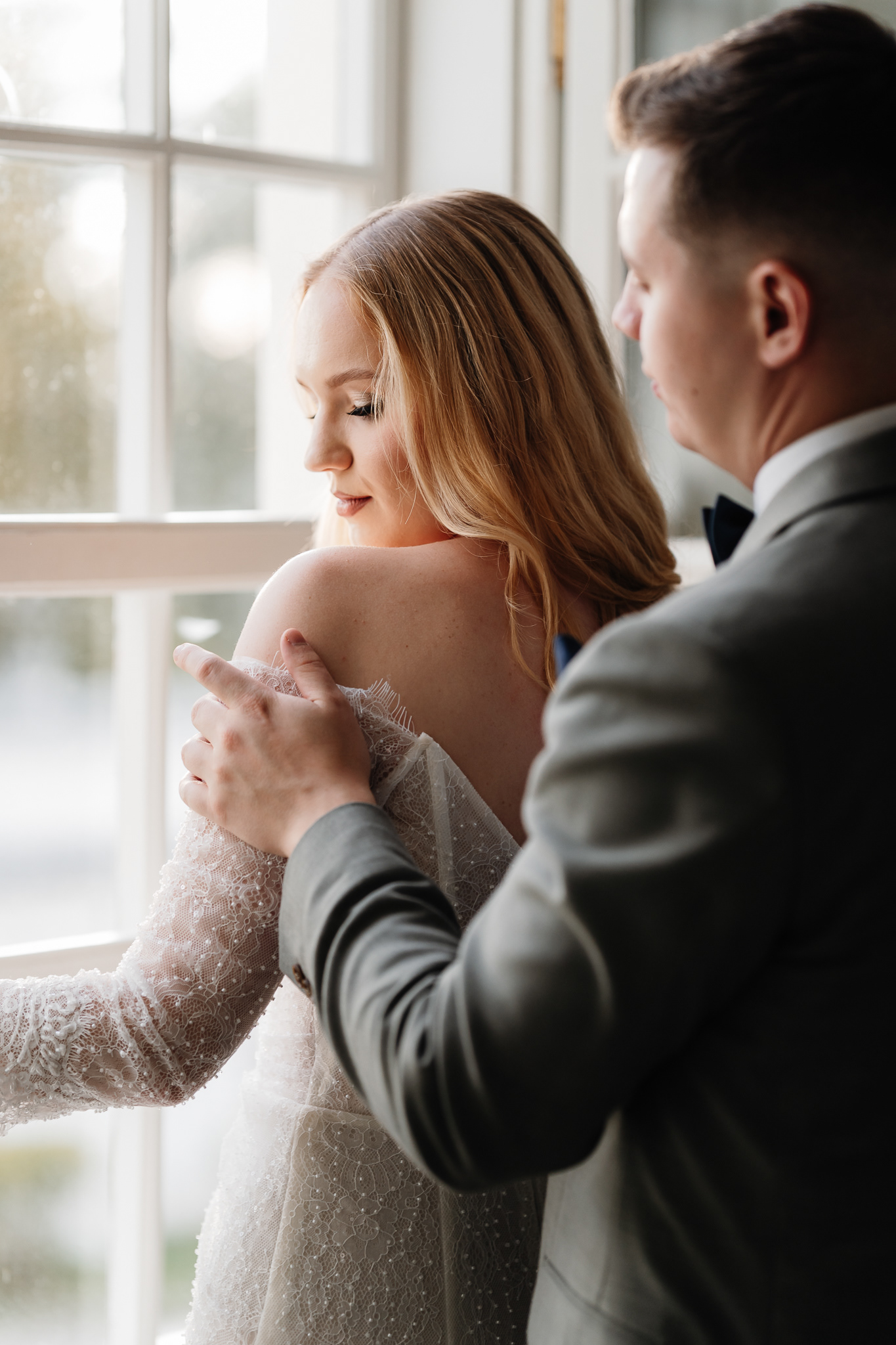 Wyjątkowa sala balowa z fortepianem, eleganckie wnętrza i magiczne światło jesiennego zachodu słońca stworzyły idealną scenerię do niepowtarzalnych zdjęć ślubnych.